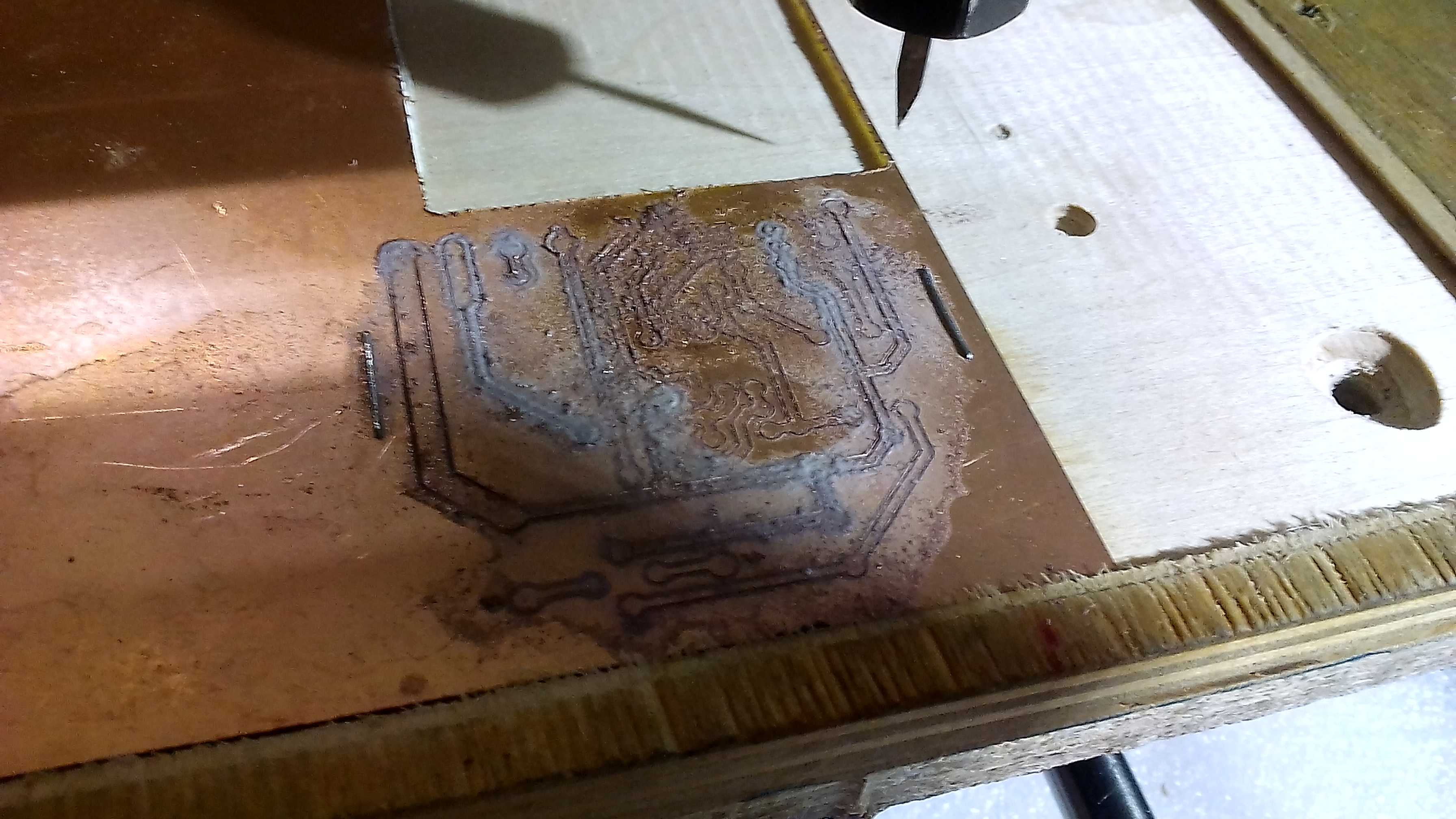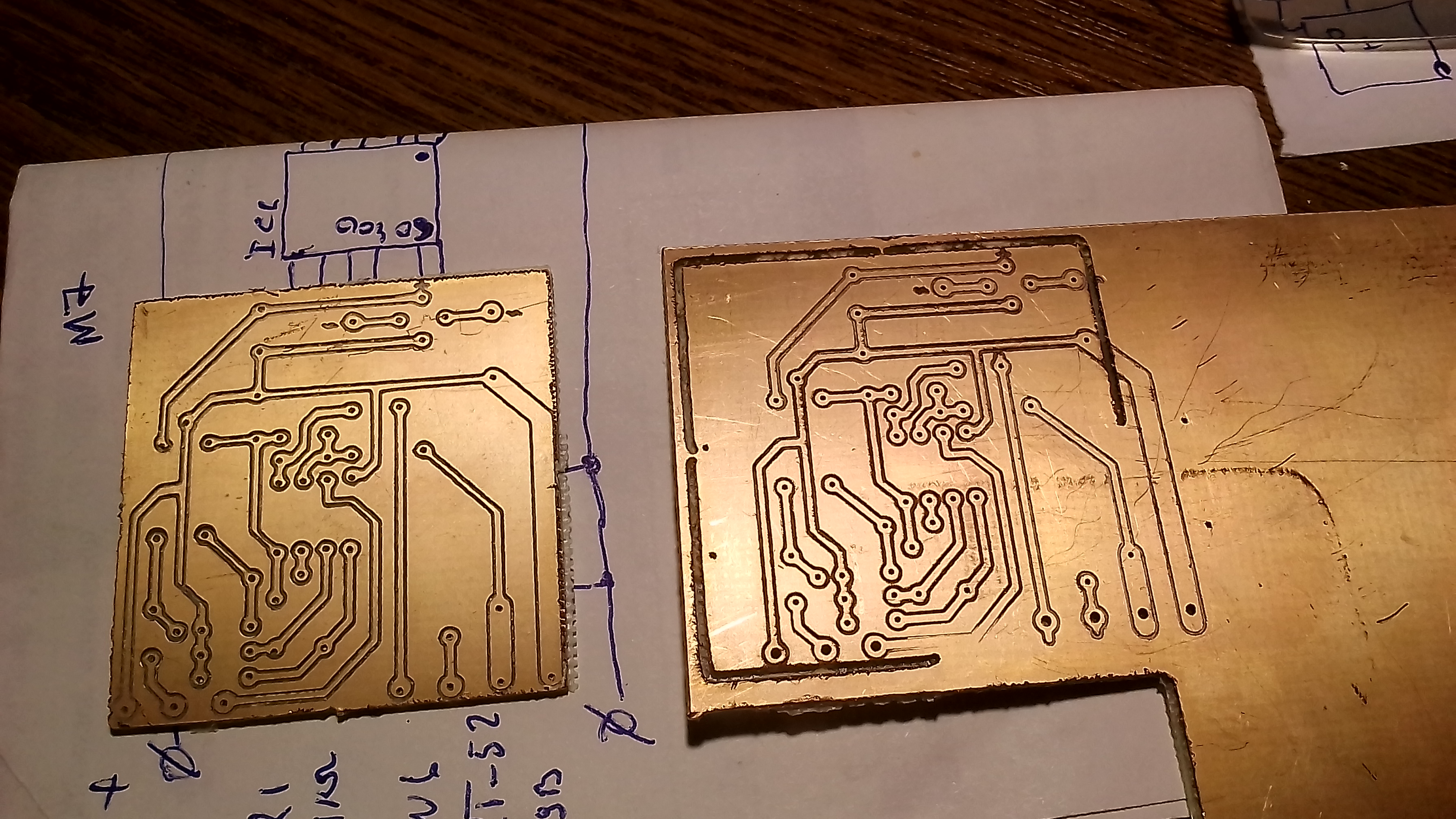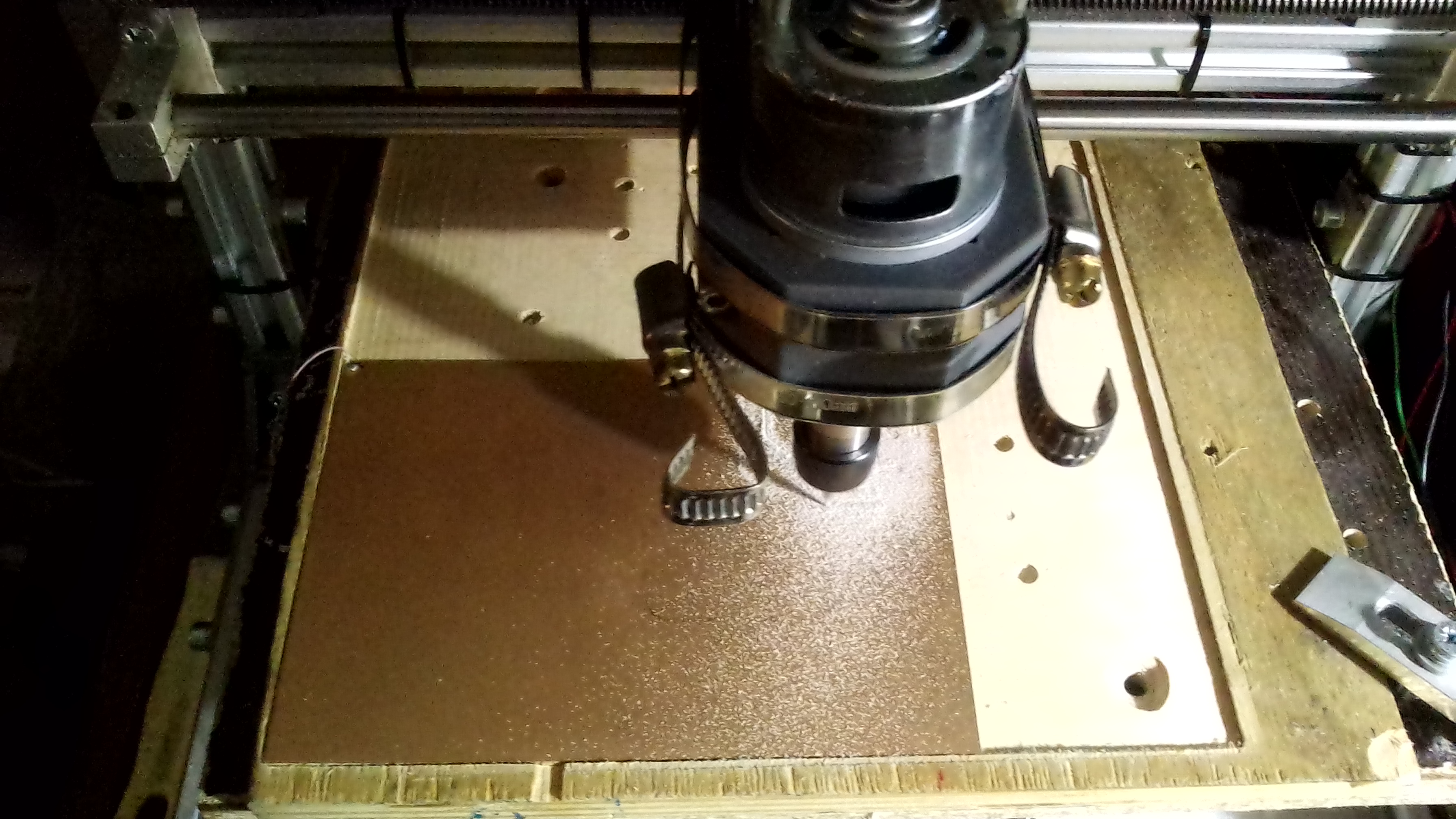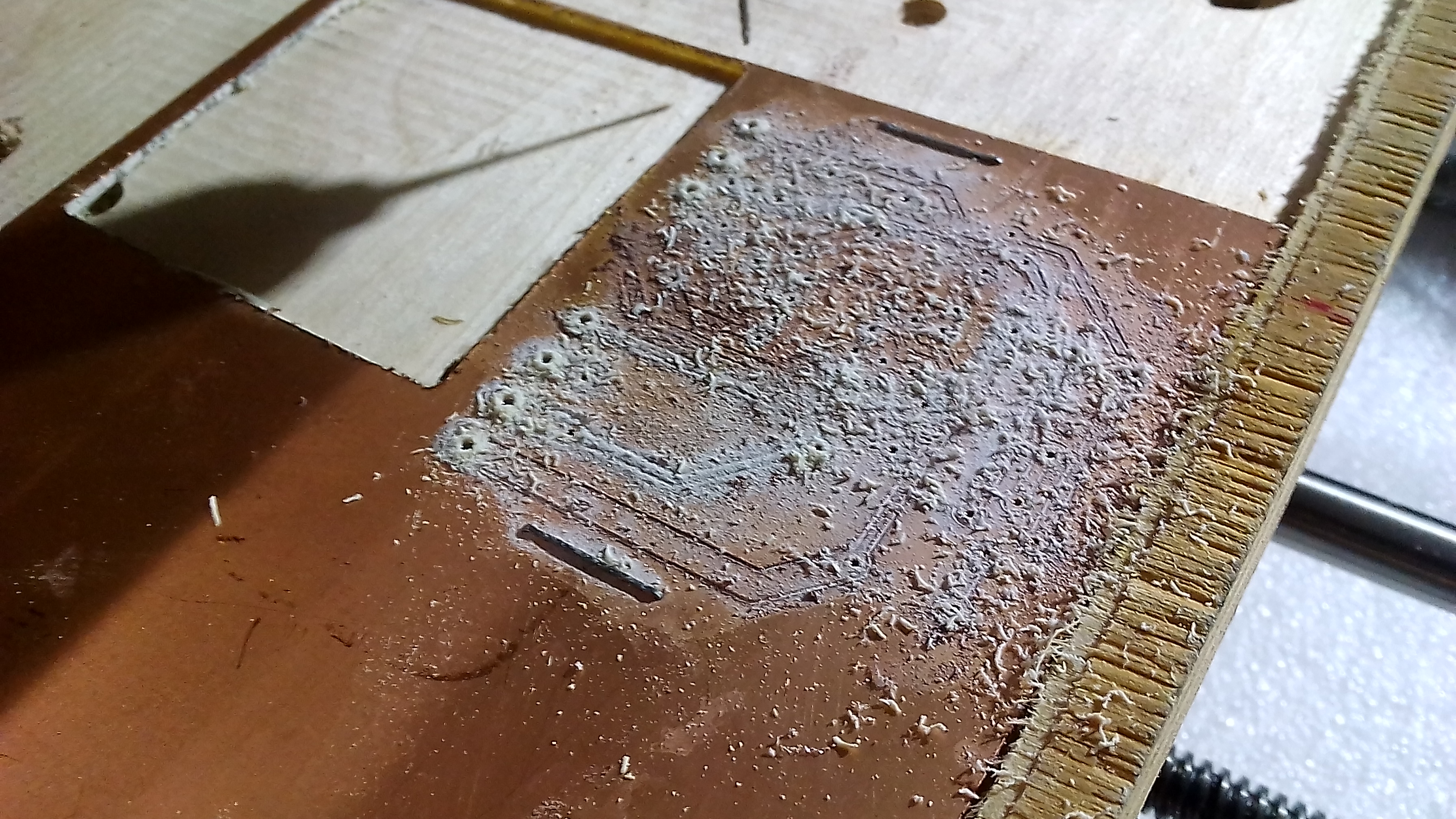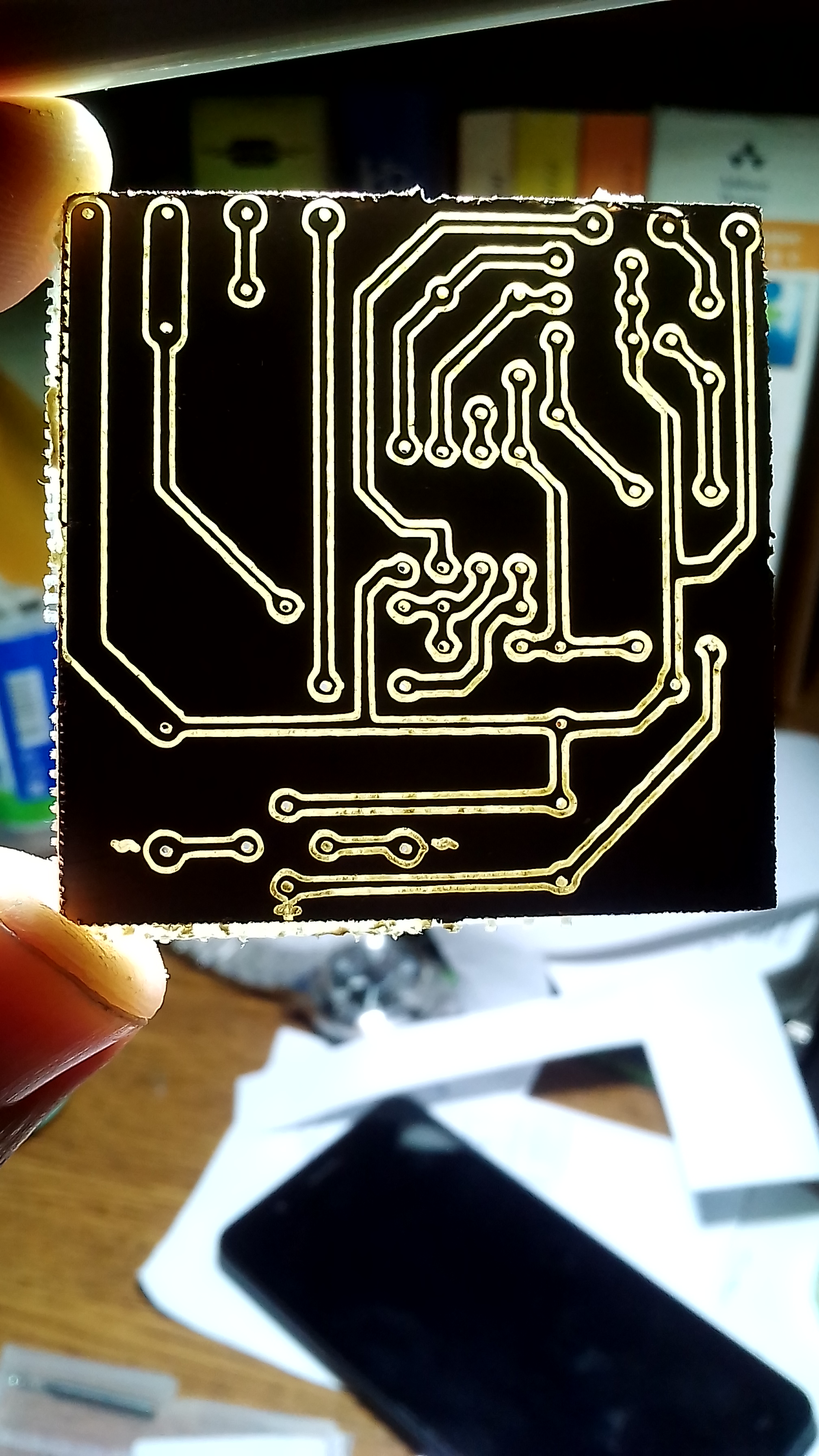 Первый запуск, гравировкой на глубину в 0,06 в два захода оказался недостаточным.. изменил параметры в FlatCam: глубина 0,1, с шагом 0,33.. На гравировку ушло 1ч 10 минут. Всё-таки 0,1 это много.. 0,08-0,09 должно быть достаточно с учётом люфтов... В общем получилось, но не без косяков... в одном месте не корректно получилась карта высот, и на финальной стадии.. тупанул уже я.. загрузил не тот файл обрезки. Тем не менее на просвет видно мелкие перемычки... здесь уже тоже моя вина.. т.к. я не заклепал заднюю крышку двигателя.. Люфты карты высот и перемычки - возможно связаны с этим фактом.. (я пока думаю, как сделать заднюю стенку из люминя.. нашёл отечественные радиально-упорные подшипники под размер 695х.. была мысль поставить пару штук..Хотя учитывая наличее "большого брата" и ожидание в 20х числах февраля механики "самыча", (profcnc 6040 ma), на который перекочуют вся электроника... Это просто трата денег в пустую.. имхо.. Хотя.. как показал текущий эксперемент.. можно делать гравировку, даже если плата находится в центре осей.. Нужно только гравирвоать в несколько заходов с подачей не больше 60мм. Плату фиксировать скобами, без скотча, использовать воду или силикон для смазки...
