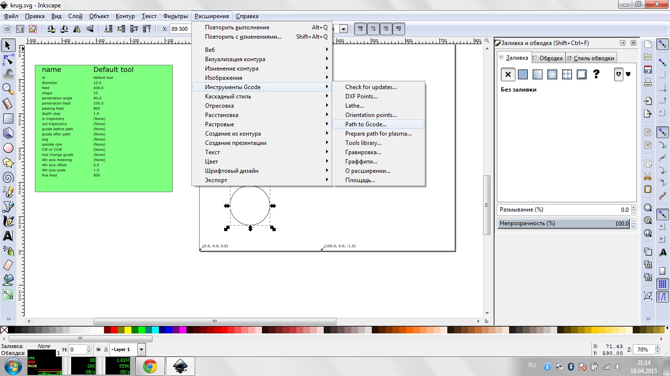 Не получается все-равно. Версия inkscape 0.91. Недавно скачивал с сайта. Не могли бы вы мне для мотивации скинуть файл с G-кодом окружности диаметром так 10 см примерно. Хочу попробовать в самодельный станок закинуть и настроить что да как (откалибровать масштаб).Посмотреть как он будет обрабатывать подобные файлы. Да и посмотреть хотя бы какой он... Пока не разберусь как переводить векторные рисунки в G-код.