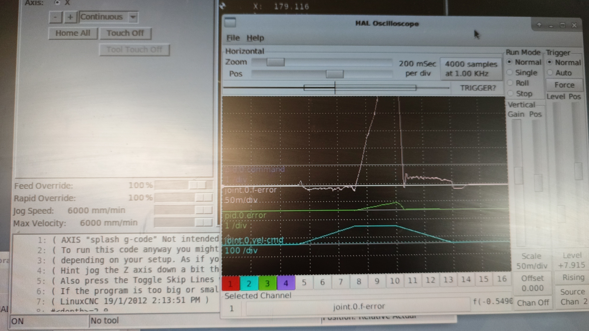 Понимаю, что вопрос не к месту, но может кто подскажет: в хал-скопе вижу небольшой пик при разгоне в пару сотых. Затем картина выравнивается и ошибка в пару микрон. ШВП транспортная подключена к серве через планетарный редуктор 1/5. В ini Backlash = 0.022.