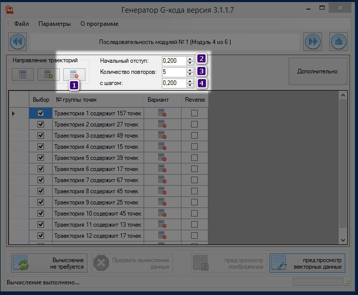Нажимаем кнопку вычисление траекторий во внутрь, и указываем начальный отступ, потом расстояние между генерируемыми траекториями, и количество траекторий.