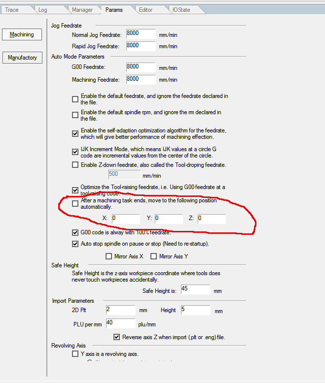 valerakru писал(а):Привет всем! Подскажите пожалуйста ,где настроить координаты парковки после окончании работы? Чтоб не на ноль парковался.