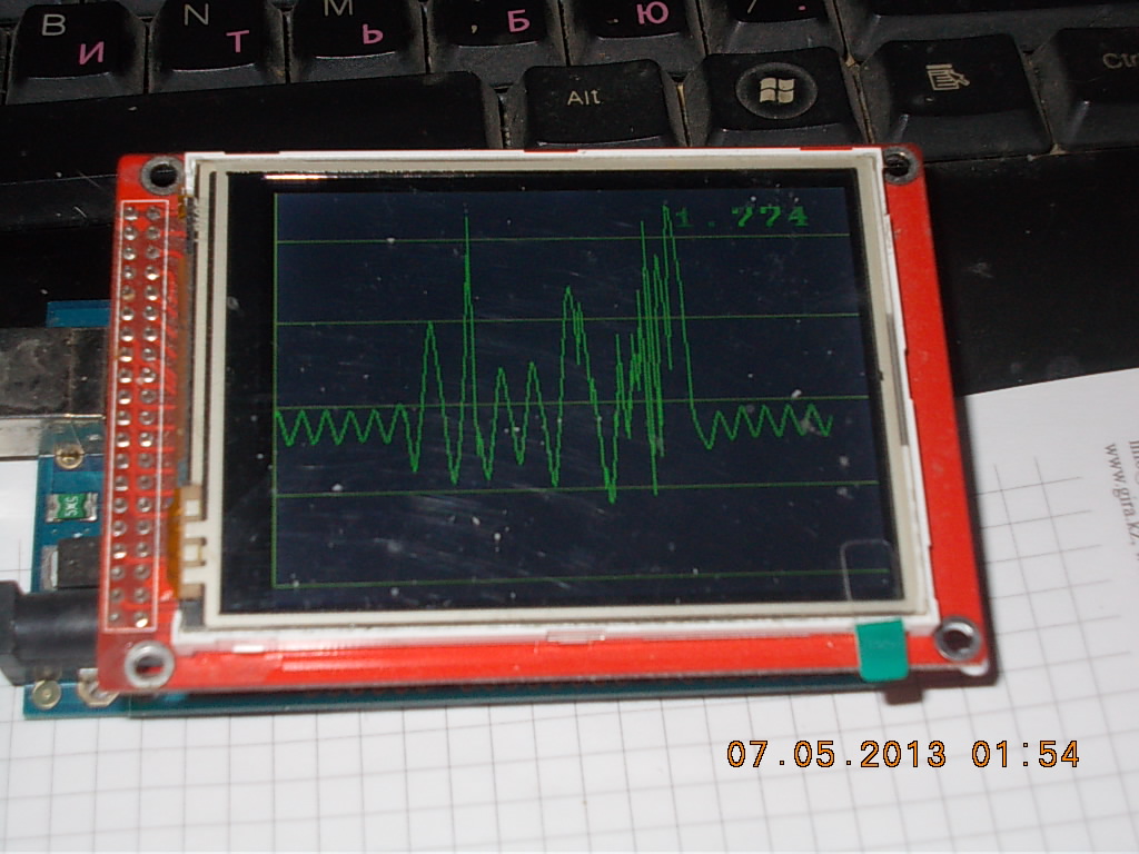 Собирался использовать тачскрин - сделать кнопки для обновления и для масштабирования графика по высоте, но тачскрин не захотел работать в том же чипе, что и прерывание по таймеру TimerOne. Точнее - если делать прерывание больше 1000 микросекунд - тогда тач начинает кое-как работать, но тут уже лучше кнопками пожертвовать, чем частотой измерений.