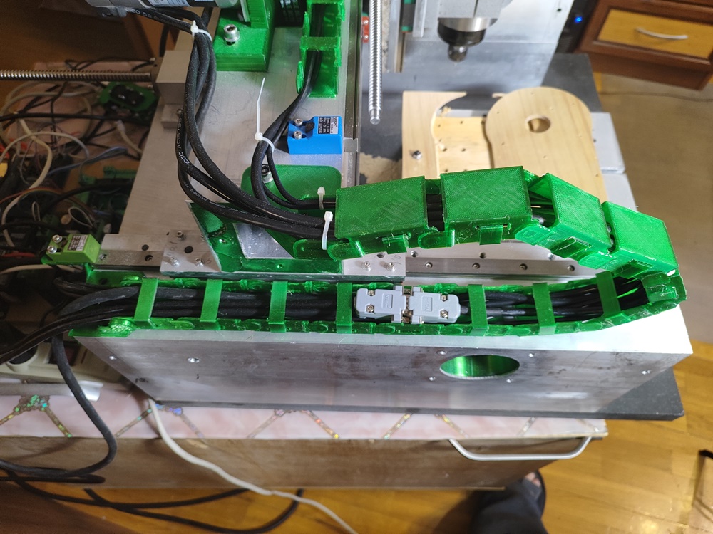 Уложил провода в короба, подшаманил hal и ini файл, настроив home и lim, чтобы они одновременно работали. Уменьшил ток на оси X, а то шаговый двигатель перегревался (рукой уже не взяться). Из-за этого пришлось уменьшить максимальную скорость по этой оси до 15 мм/с (900 мм/мин).
