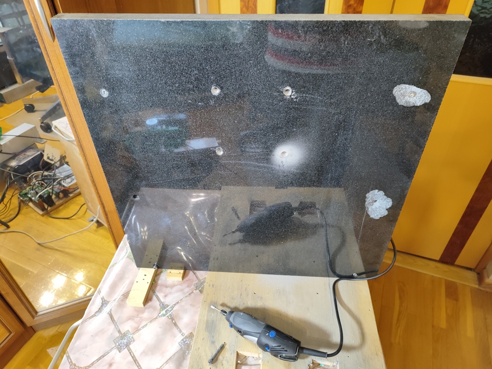 В выходные разобрал станок. Чуток допилил плиту. Теперь, по крайней мере, все отверстия можно использовать для сборки и какой-никакой зазорчик появился. Стол тоже прикручивается намного лучше, хотя с ним есть ещё что поделать - получше притереть, например.