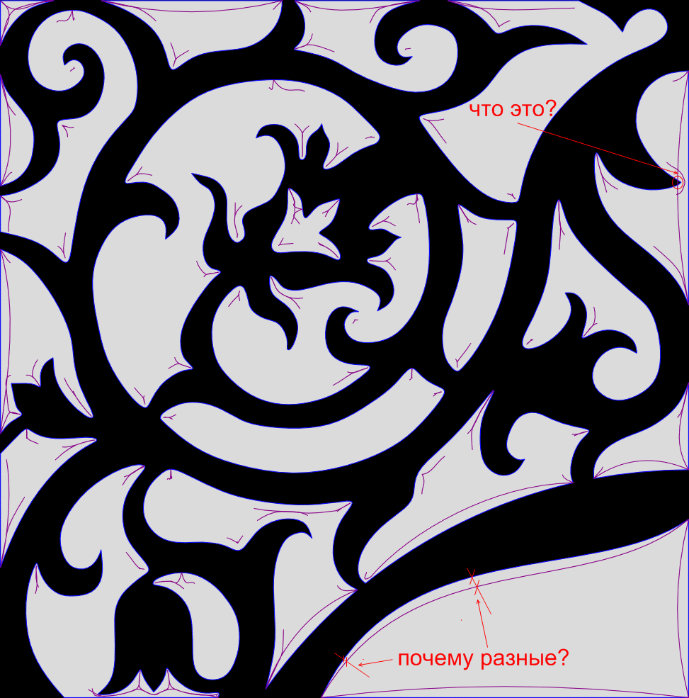 Пара неясных мест! Справа сверху траектория залезла на контур. все траектории почему-то отходят на переменное расстояние от контура (ожидается, что расстояние должно быть постоянным, пока укладываются D фрезы между ближайшими линиями контура).