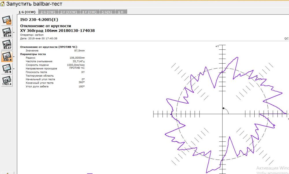 Да там программа работает как-то любопытно, пока об этом не задумывался.aftaev писал(а):У BallBar программа хитро работает. Задается измерительная окружность, например ф150мм. Программа генерит Gcode. В Gcode есть отводик на 151мм. Запускается софт балбара и он ждет пока щуп не сдвинется на 1мм (150мм). Как только программа это обнаружила, стартует считывание данных с датчика. А так как софт "писал" Gcode для станка, то знает с какой скоростью двигается станок и с какой скоростью опрашивать датчик и рисовать график.