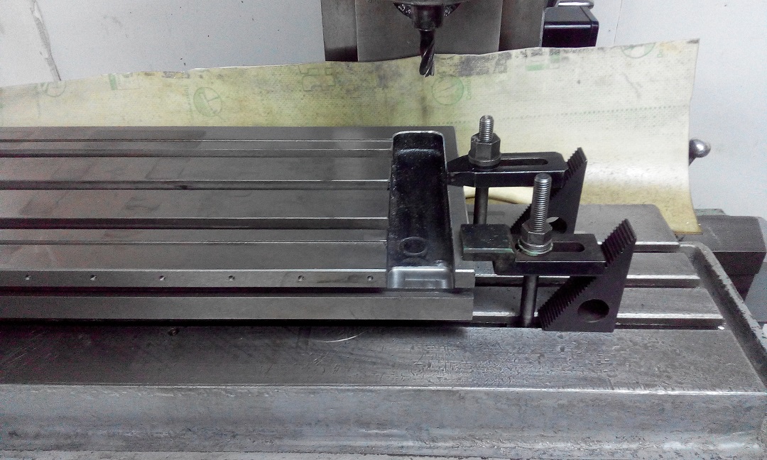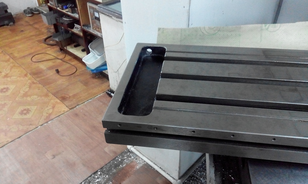 Дело подходит к организации СОЖ в полном объеме, поэтому станок требует некоторых доработок. По краям стола сделаны карманы, и в одном из них сделано маленькое резьбовое отверстие для слива СОЖ. Просто смешно. Чтобы СОЖ как можно быстрее покидала станок убрал одну стенку в каждом кармане, еще предстоит сделать отводы из листового железа, иначе все будет стекать на ласты.