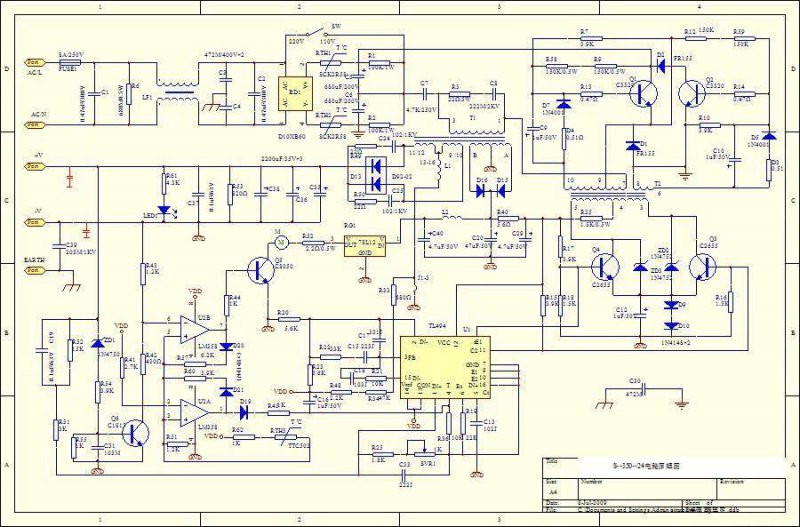 Проверьте термисторы (должны иметь небольшое сопротивление). Проверьте транзисторы Q1, Q2 (см. прилагаемую схему, надеюсь отличия будут незначительны) и диоды в их базовых цепях и между коллектором и эмиттером этих транзисторов, а также диоды D12- D15 во вторичных цепях трансформатора. Замените неисправные компоненты, если они бнаружатся. Далее можно отключить резистор, подключенный между конденсатором С20 и выводом 4 трансформатора Т2, последовательно с блоком питания включить лампу 220V 60Вт и включить в сеть. Будьте осторожны, там действительно "живет" напряжение 300V (на конденсаторах С5, С6 за диодным мостом примерно по 150В на каждом). БП должен "завестись" в режиме самовозбуждения, на выходе БП должно появиться напряжение, оно может быть ниже номинального. Лампа при этом должна слегка светиться, либо не гореть вообще. В случае, если она горит в полный накал, где-то имеет место пробой. После этого можно будет пойти дальше.