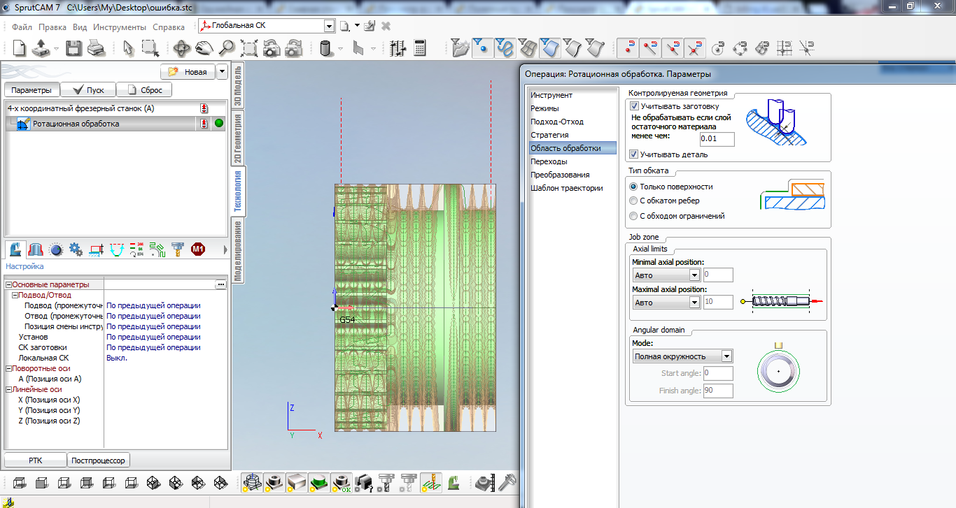 Маюсь второй вечер .не могу заставить SprutCam 7.1.6 выполнить ротационную обработку конической фрезой. Он постоянно делает непонятный завихрения с обоих торцов шестерни. (К слову Powermill ведет себя так же) . Видимо что-то не учитываю в настройках траектории. пробовал создавать прямоугольник в 2Д редакторе и обзывать его рабочей зоной- ноль эффекта . Пробовал указать торцевые поверхности как зона ограничений -ноль эффекта.