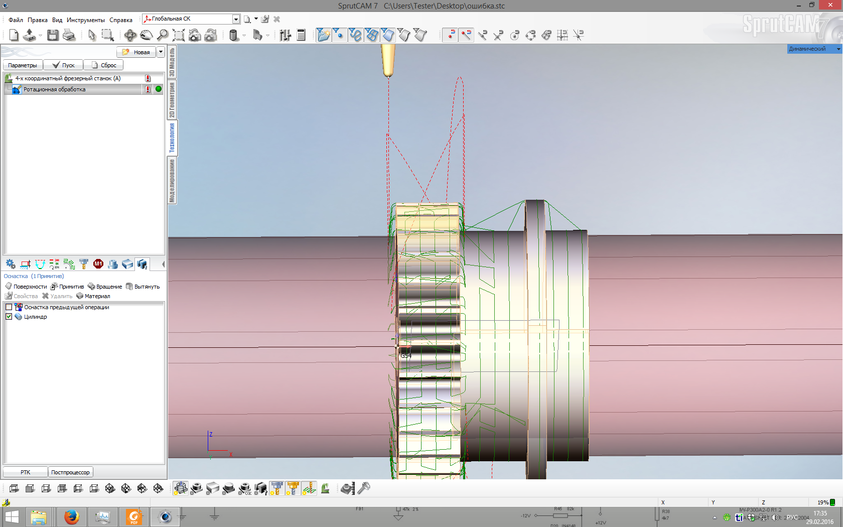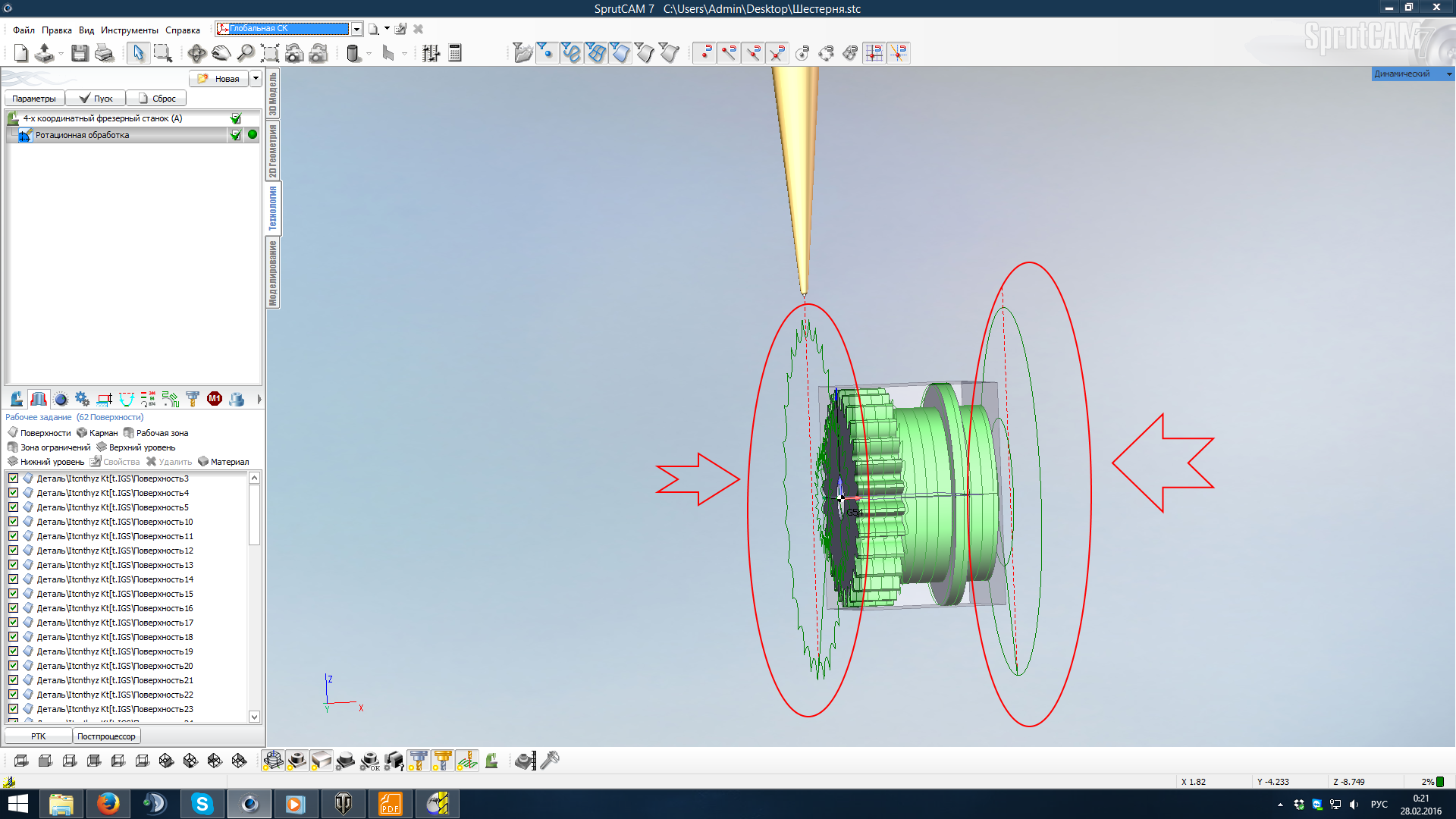 Маюсь второй вечер .не могу заставить SprutCam 7.1.6 выполнить ротационную обработку конической фрезой. Он постоянно делает непонятный завихрения с обоих торцов шестерни. (К слову Powermill ведет себя так же) . Видимо что-то не учитываю в настройках траектории. пробовал создавать прямоугольник в 2Д редакторе и обзывать его рабочей зоной- ноль эффекта . Пробовал указать торцевые поверхности как зона ограничений -ноль эффекта.