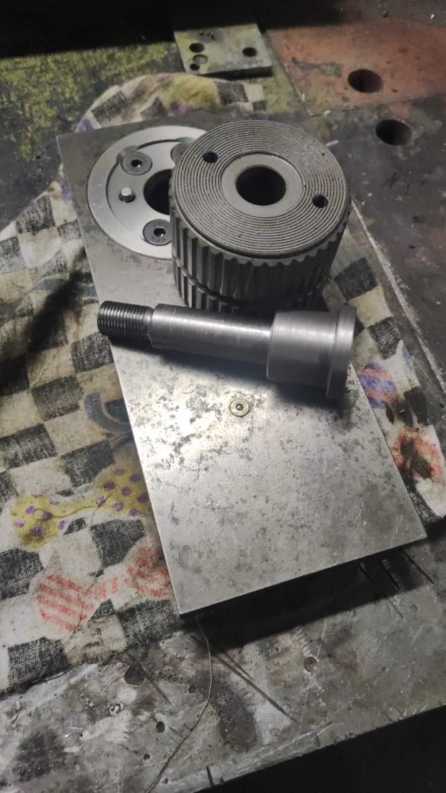 Чтоб поставить мультификс, нужно изготовить две детальки - блин вместо родного с призмами под малую продольную и валик, на который все потроха мультификса собираются. Выточил на соседнем токарнике блин, посверлил, отдал его парням, чтобы пошлифовали нижнюю сторону.