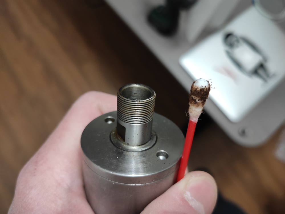 Приехал шпиндель. Пока без отзывов на алике, поскольку общаюсь с продавцом. Ощущение двоякое. С одной стороны, конструкция именно такая, какая нужна (ну может подшипников маловато), все сделано из стали, радиально-упорные подшипники, конус и резьба на валу, не люфтит, биение конуса укладывается в сотку. С другой стороны, это явно БУ, а мой экземпляр еще и неправильно хранили. Стопорные гайки на валу не откручивал, нет подходящего инструмента, но надеюсь, что подшипники со смазкой. Но вал и все, до чего дотянулся, пришлось отмывать и смазывать. Особенная жесть была в отверстии конуса, грязные ватные палочки и куски грязи на фото - это все оттуда. Ну и на конусе в глубине есть глубокая ржавая царапина. Вцелом, работать с таким можно (зажимал фрезы, замерял биения, 1-2 сотки на вылете 15мм, не катастрофа), но я не знаю, попался ли мне худший вариант, или бывают еще хуже (последнее фото - после отмывки)
