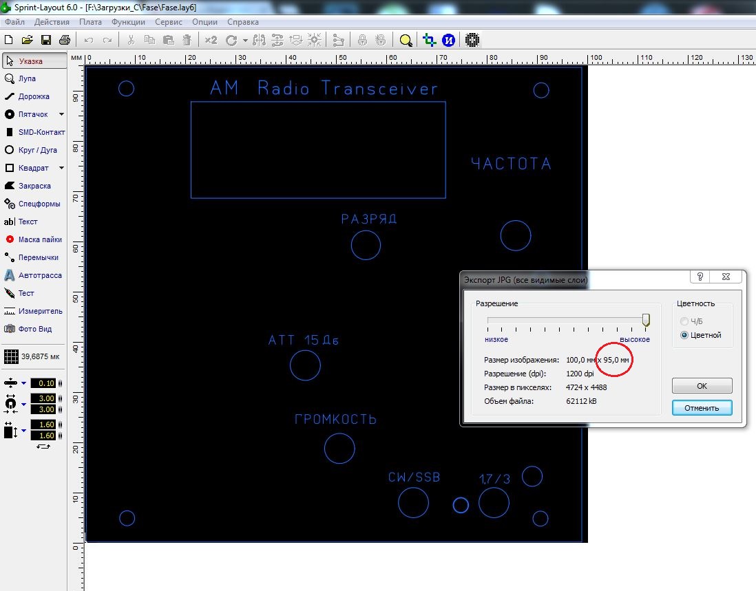 Экспорт в Jpeg. Далее задается первый размер в программе 99,25. Программа правильно вычисляет второй размер: 95,249.