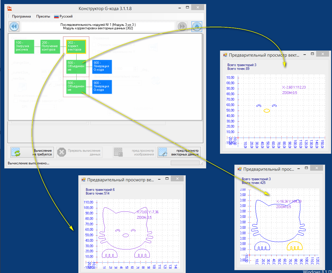 Выбираем рисунок, из него получаем контуры, потом масштабируем до нужных размеров, а потом создаем 2 строки действий, используя модуль №500 (в котором из всего списка траекторий выбираем только нужные), и потом формируем 2 разных файла с G-кодом, первый файл с профилем "Гравировка", а второй файл с профилем "фрезеровка"