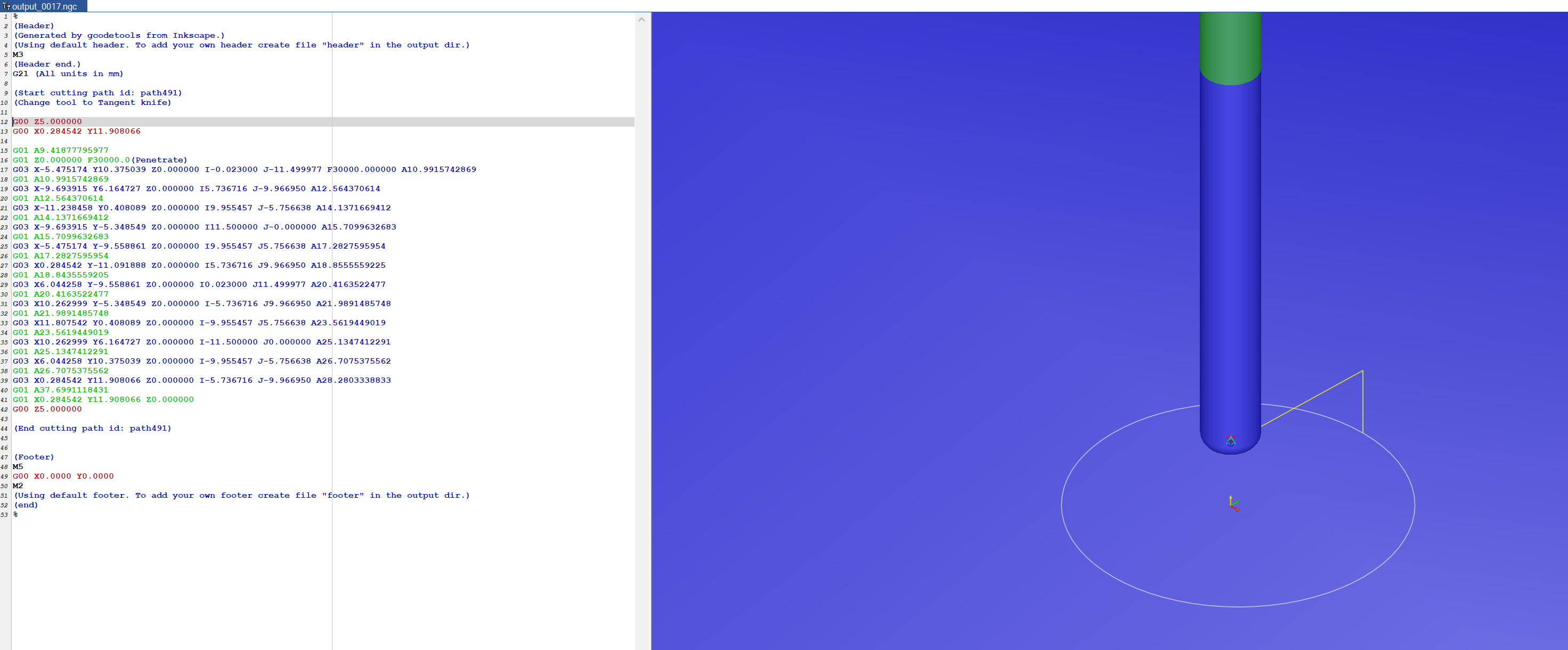 • Экспорт в Gкод для плоттера с тангенциальным ножом. Четвертая ось A - угол наклона ножа.