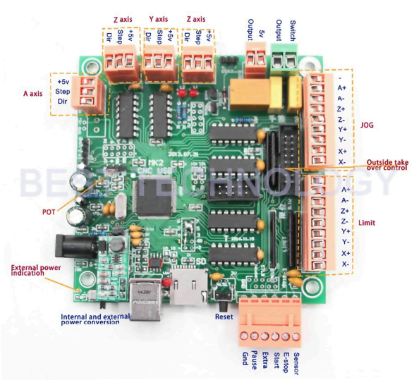 Ваша ссылка вообще на колхозный МК1, там чип микроконтроллер pic18 серии, там вообще много что урезано, скажем нет сканирования сетки высот, нет отдельного входа на тул сенсор, он совмещен с концевиком Z оси, и как мне помнится нет регулировки оборотами. В МК2 чип и возможности совсем другие, есть модификации МК2 даже на 9 осей.
