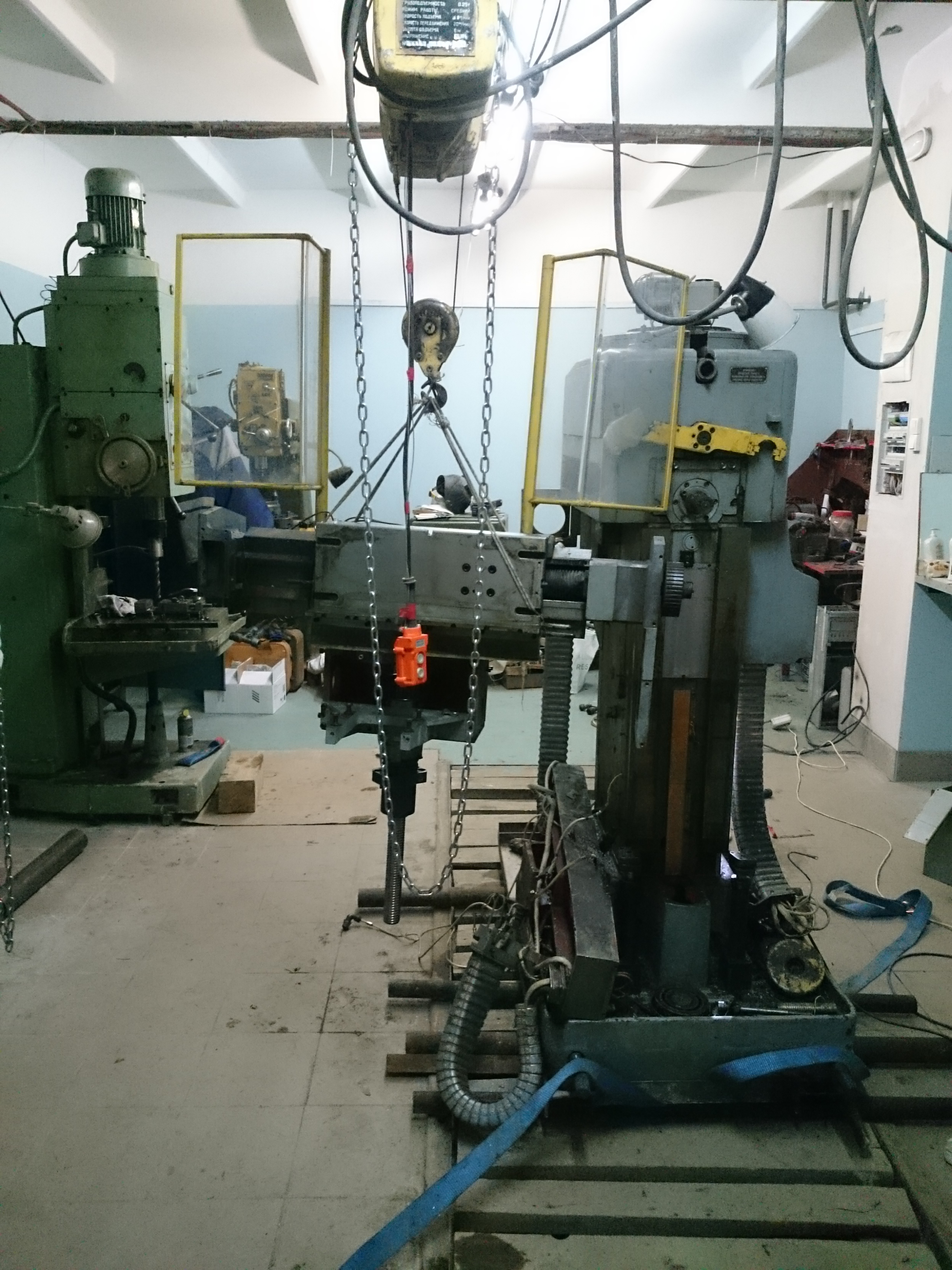 Перевязал чуть повыше, опустил, с помощью второй тали выровнял, станок на покатах, двигать на место и фотографировать буду завтра после мытья полов. Сегодня чутка подустал и в масле весь...