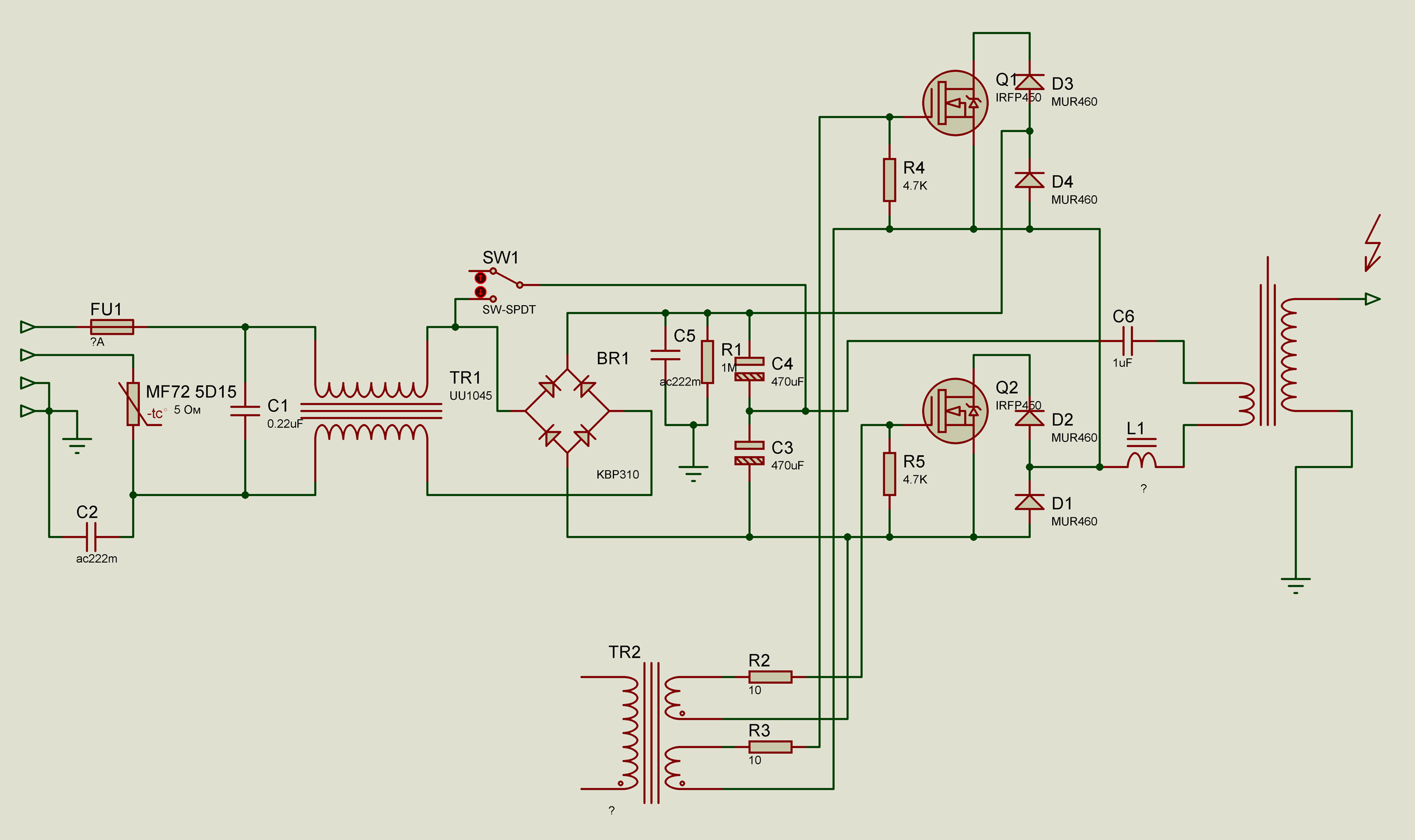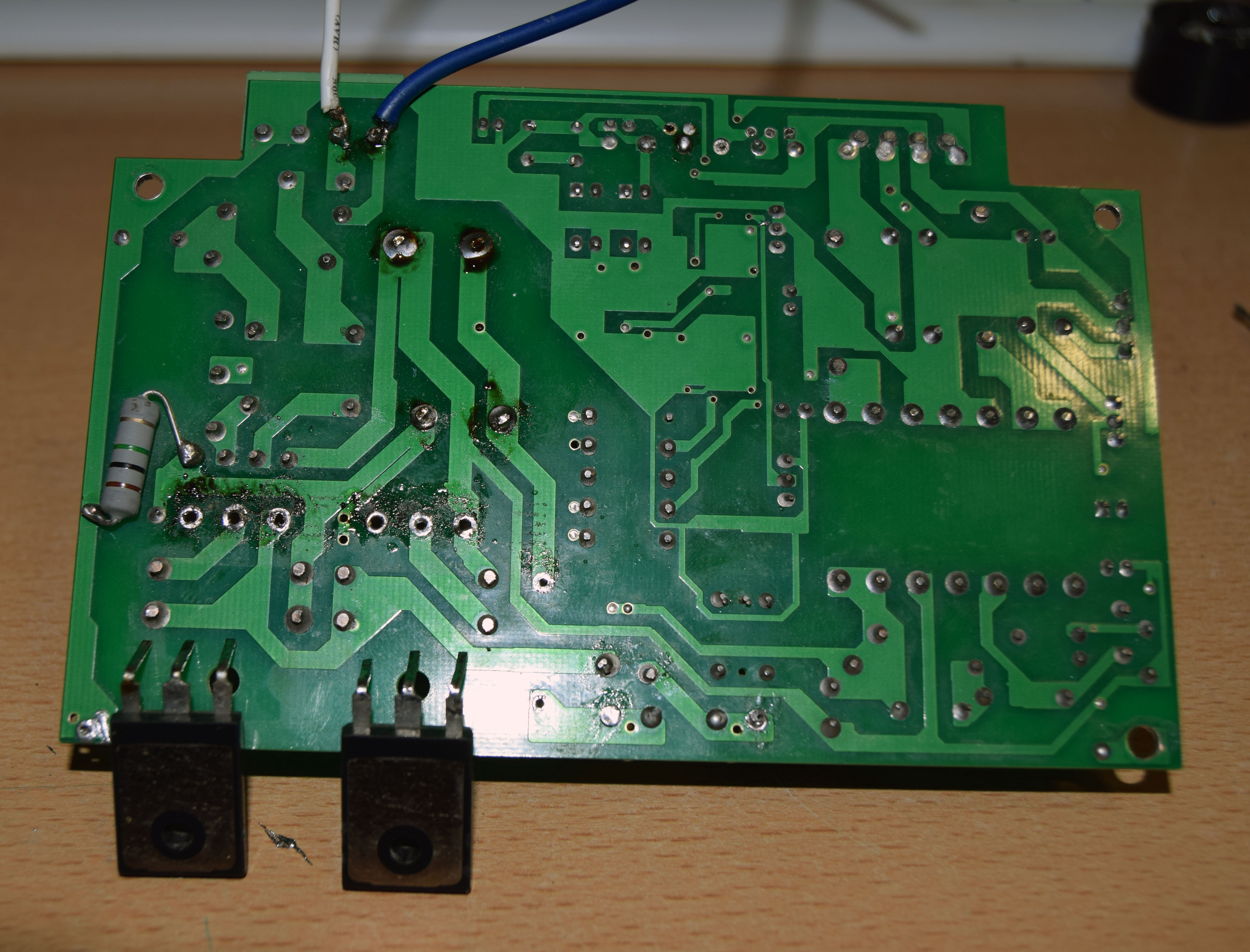 Трансформатор цел. Труба тоже. Для проверки был куплен строчник PET19-01, подумал что его 25кВ хватит для луча, чтобы напрасно не тратить 2000 руб. на новый транс. Сижу дома верчу в руках новенький строчник, стукнула мысль в голову, что надо визуально оценить скачок напряжения на высоковольтной обмотке. Вооружился заряженным li-ion аккумулятором. Для начала дёрнул пальцы, затем кинул щупы от тестера в режиме 1000 В. Разряд... и тестер приуныл :yawn: . показывает 1.... Я был немного недоволен такой ситуацией, но утешал себя тем, что раз от 4,15 вольт в первичке на 118 сгорел АЦП в тестере, то в станке он (строчник) точно заработает (там на старом с входа 100 вольт на выходе было 600). Еду в гараж, подпаиваю строчник, вкл, проба - ноль, запуск файла с 90% мощности - ноль. Чё делать? Если рабочий строчник не зажигает луч, то сгорело что-то до строчника. Чем прикурить? Беру пусковой конденсатор, подключаю к трубке старый транс, разряд!!! и есть луч :ura: . Он слабый, но заметный. Надо отдать должное строчнику, он тоже выдал луч, правда сильно слабее и от обмотки накала, а не от обмотки 118 вольт. Дальше всё отключаю и еду в тепло, в итоге после рассматривания платы родилось это: