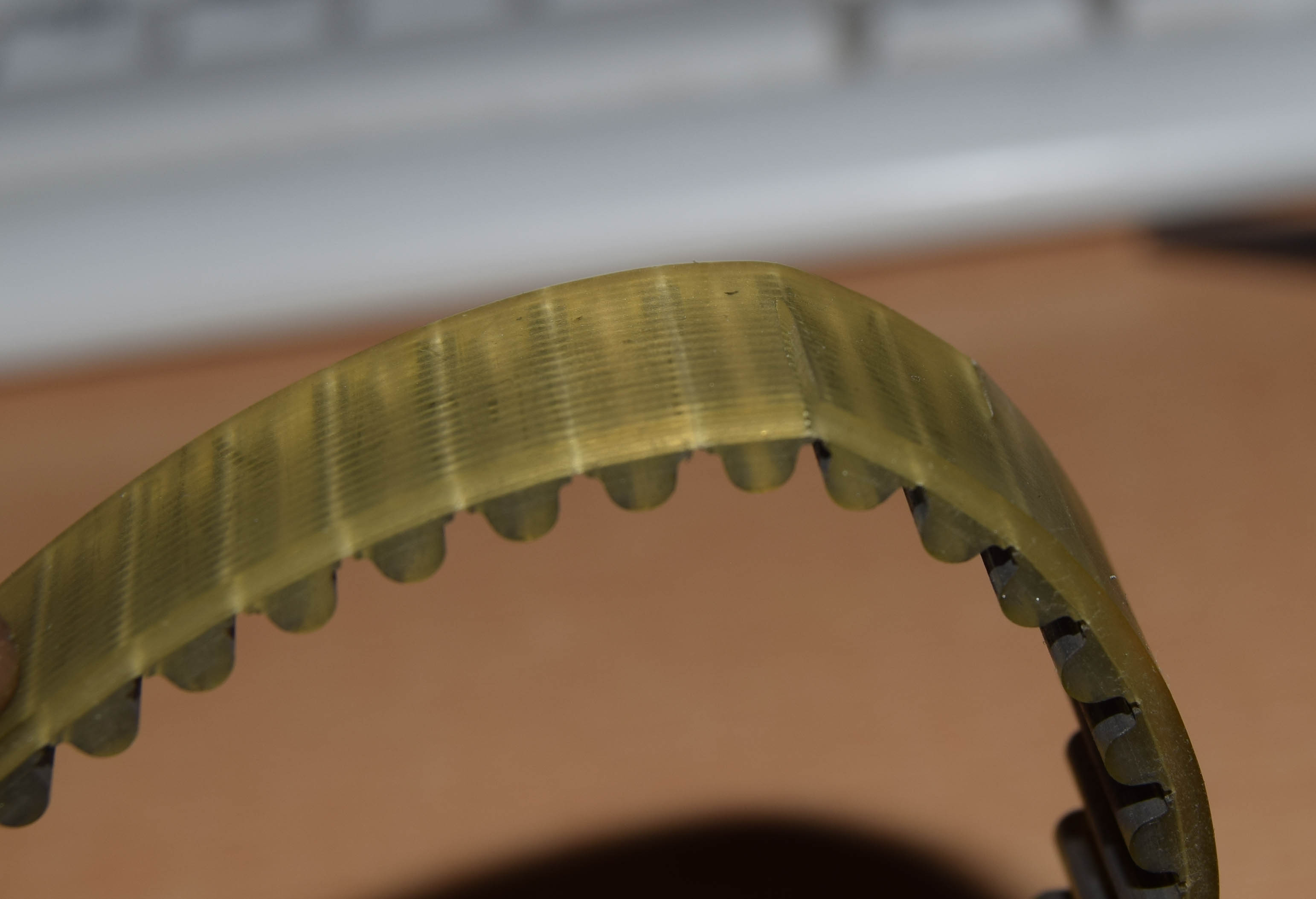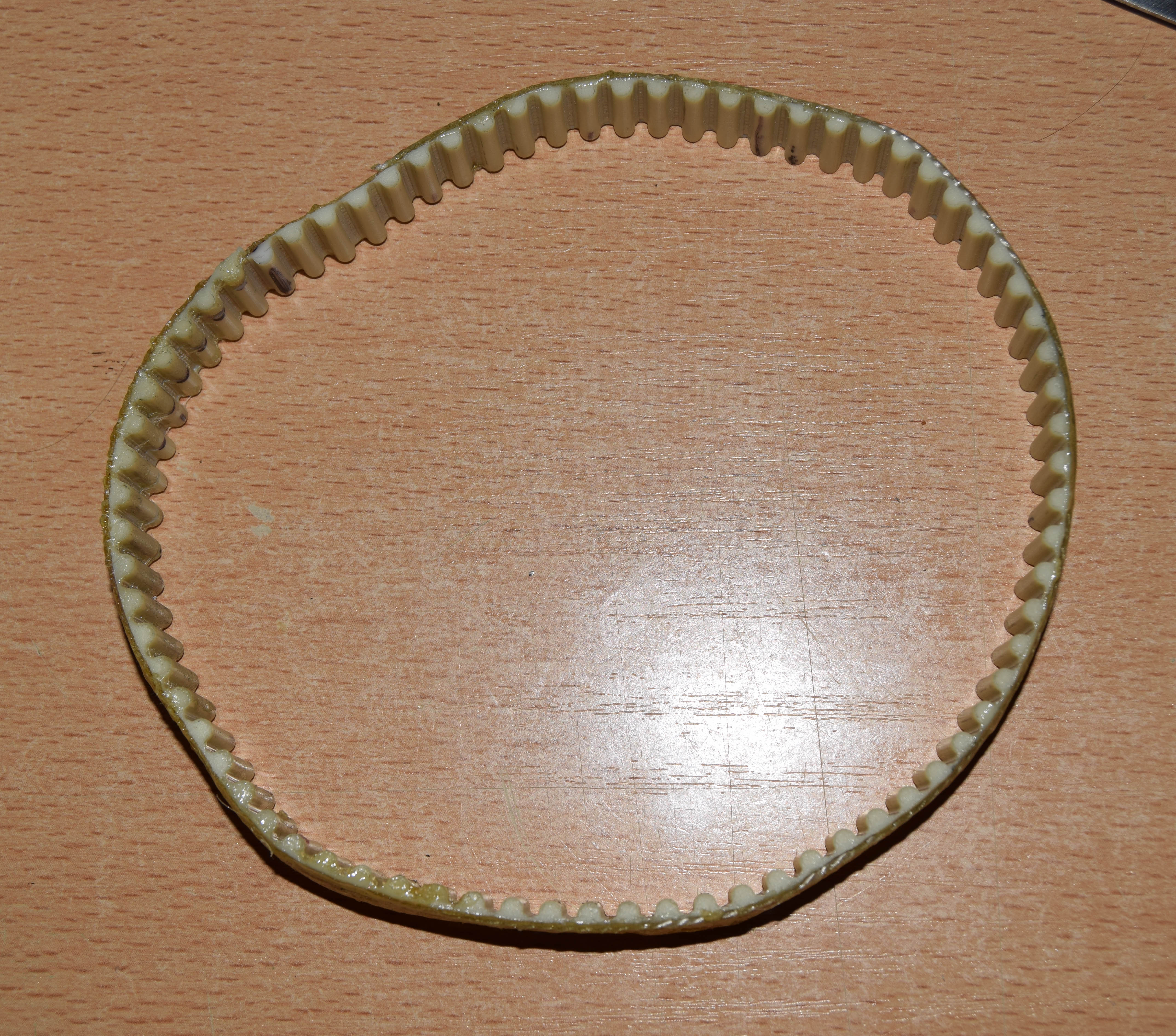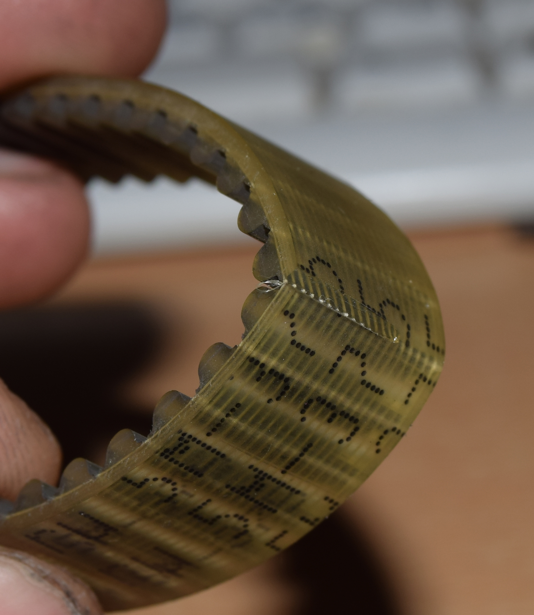 Дня начала немножко гнева! я не буду называть вслух фирму, её и так видно на ремне, но мало того, что эти ремни обрываются, так ещё и точность хромает, заказано было 5М, он и по профилю и по названию совпадает, а на деле имеем что-то около 4,9 (а я то думал, что он скрипит постоянно? :thinking: ). Вот измерения оборванного ремня: