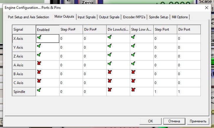 Я вчера снимал диаграммы сигналов управления ШД с STB5100. И, чтобы не перетыкать щупы, решил поменять пины в настройках Mach3.