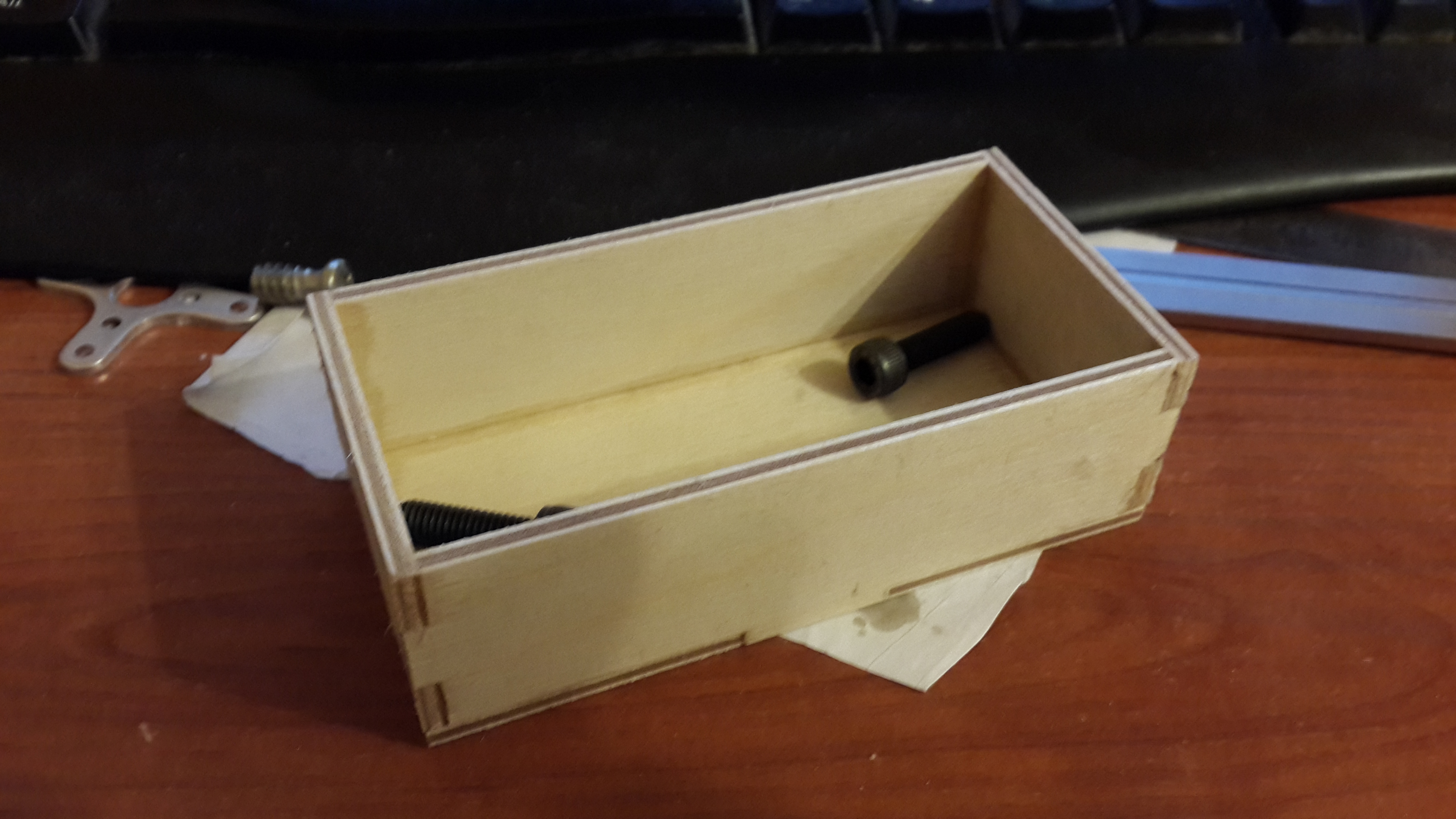 Коробочка для проверки стыковки шип-паз. Тут была небольшая проблема, все детали получались меньше на 0.2 мм. Проверил позиционирование, вроде все четко. Пришел к выводу, что фреза снимает на 0.1 мм больше. Если в УП задать диаметр фрезы на на 0.2 мм меньше - то все четко. Причем 2 десятки не важно какого размера деталь, хоть 30 мм хоть 1000.