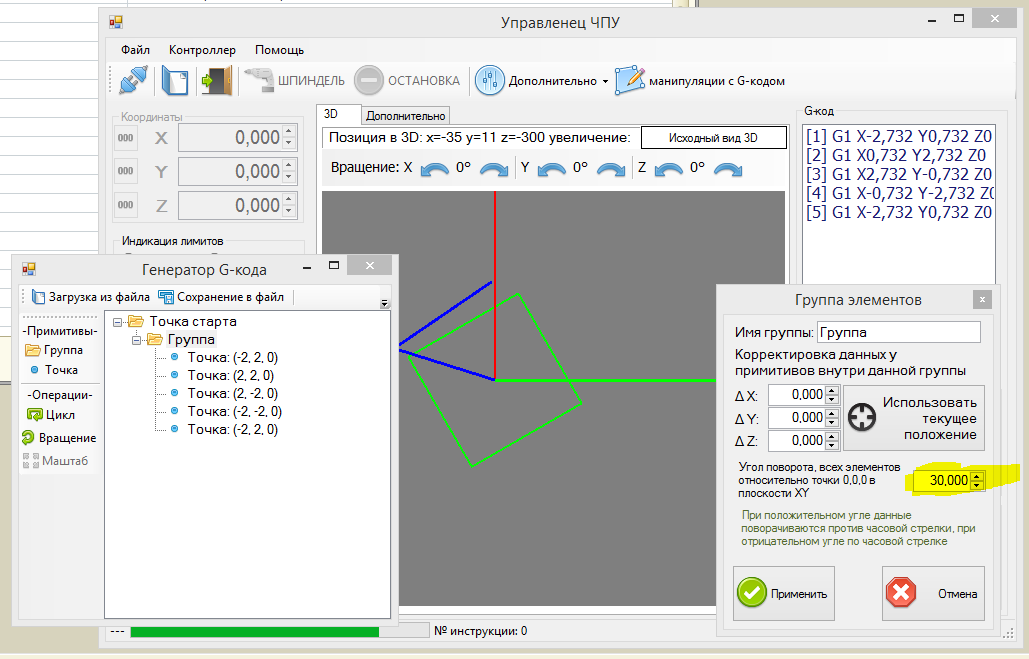 1) Добавил ещё пару вещей в конструктор, теперь с каждым шагом вращения, мошно изменять радиус, благодаря чему получается спиралька. 2) Если создать группу с точками, например в виде квадрата, то в последствии, можно выполнить поворот всех точек в группе, относительно центра осей (0,0): 3) А если к этому добавить пару линий опускания, поднимания, и фукцию вращения, то можно получить вот такую штуку: 4) В функцию добавил ещё опцию, с помощью которой при каждом шаге, можно ещё применять вражение для группы примитивов, и тогда получается так: 5) Так-же получаются и такие штучки: