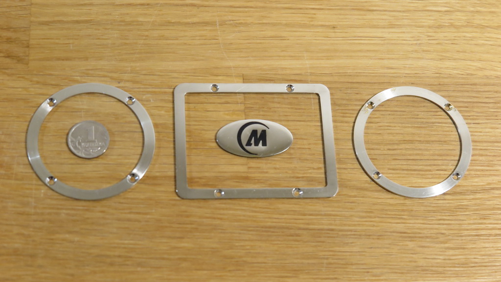 Латунь нашлась даже тоньше - 1мм. Городить огород со скотчем и суперклеем не пришлось, т.к. у деталей есть отверстия, которые можно было использовать для её крепления на станке. Станок грызет латунь удовлетворительно, хоть и тонкими слоями.