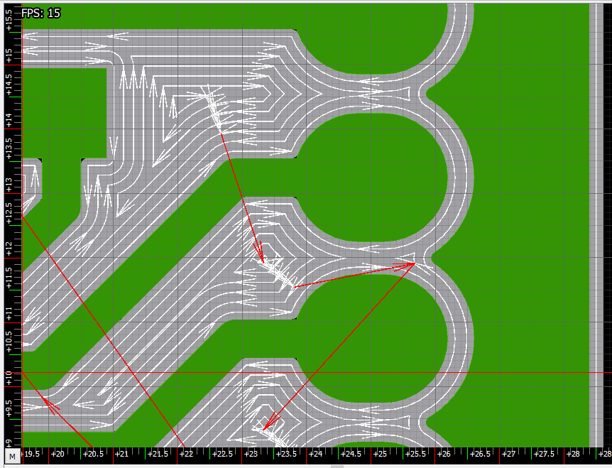 PS Хотя (смотрим на скрин со 100% отступом), если сделать возможным второму инструменту (даже с таким же диаметром) пройти по не прорезанным (оставшимся) островкам, поднимая фрезу только в тех случаях, когда нужно не зацепить медь (это чтобы не тратить время на лишние подъёмы и опускания фрезы, и фрезеровать при этом и сами островки не прореза и кротчайшие отрезки между островками не прореза, где меди нет уже), то итоговое время будет намного меньше, чем при 50% отступе. Но это нужно вводить дополнительную такую опцию в GGEasy совместно с возможностью 100% отступа (0% перекрытия).