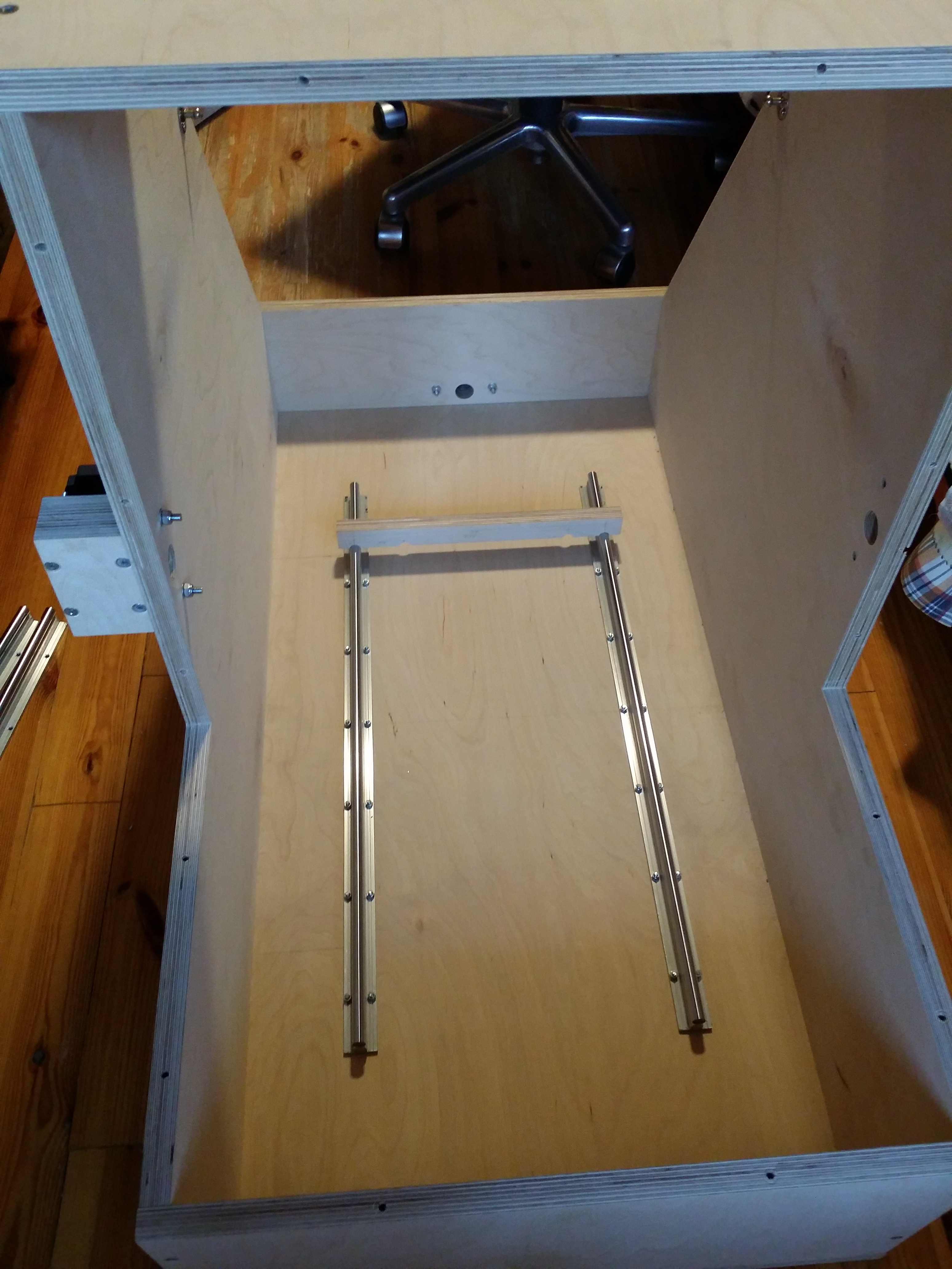 Отверстия под каретки пришлось сверлить 7мм (там винты на 5), поскольку фанера и руки дают погрешность.