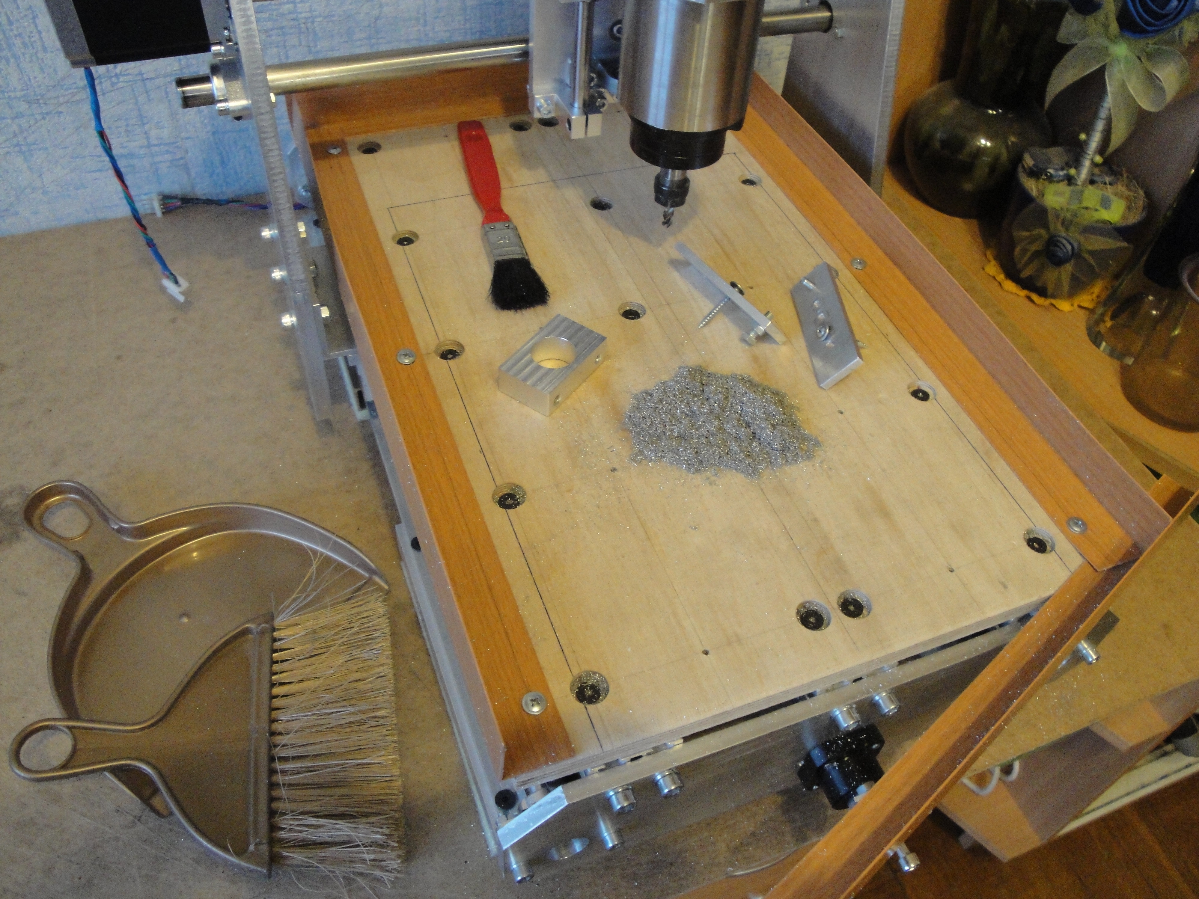Также рекомендуется ограничить пределы "столика" и какими-нибудь угольниками повыше, чтобы стружка оставалось внутри и не рассыпалась вокруг станка. Я обычно это делаю пластмассовыми угольниками из строительного магазина, получается просто и без особых хлопот. Также можно поверхность "столика" и накрыть слоем полиэтилена, тогда стружка собирается еще проще, да и возможно ограниченное использование различных охлаждающих жидкостей. Правда, эти "ограничители" эффективны лишь при обработке металлов, так как стружка от них не имеет обыкновения "висеть в воздухе". Если стружка висит в воздухе (дерево, пластмассы), то тут лучше использовать пенопластовый короб, о котором писал ранее на этой ветке.