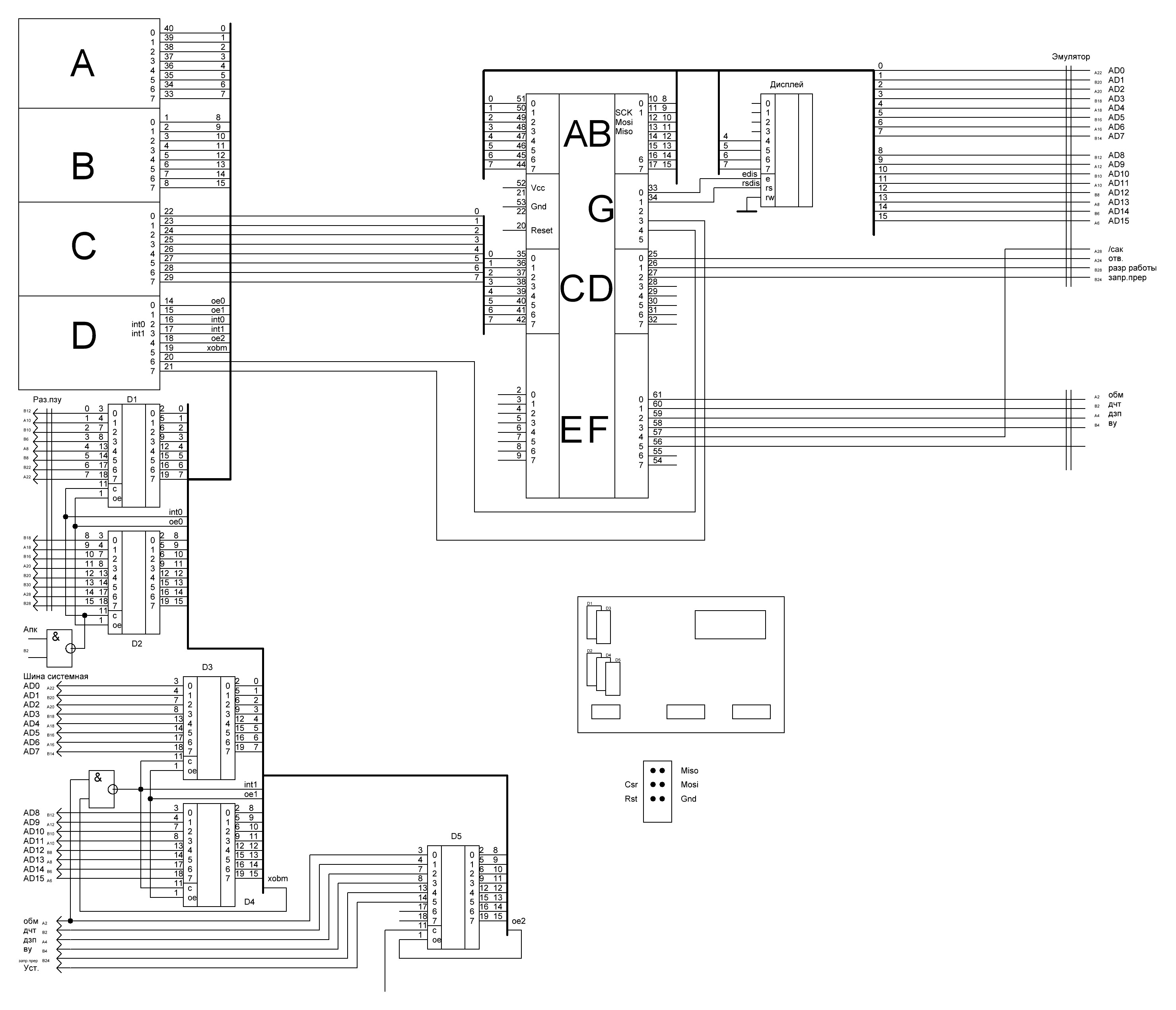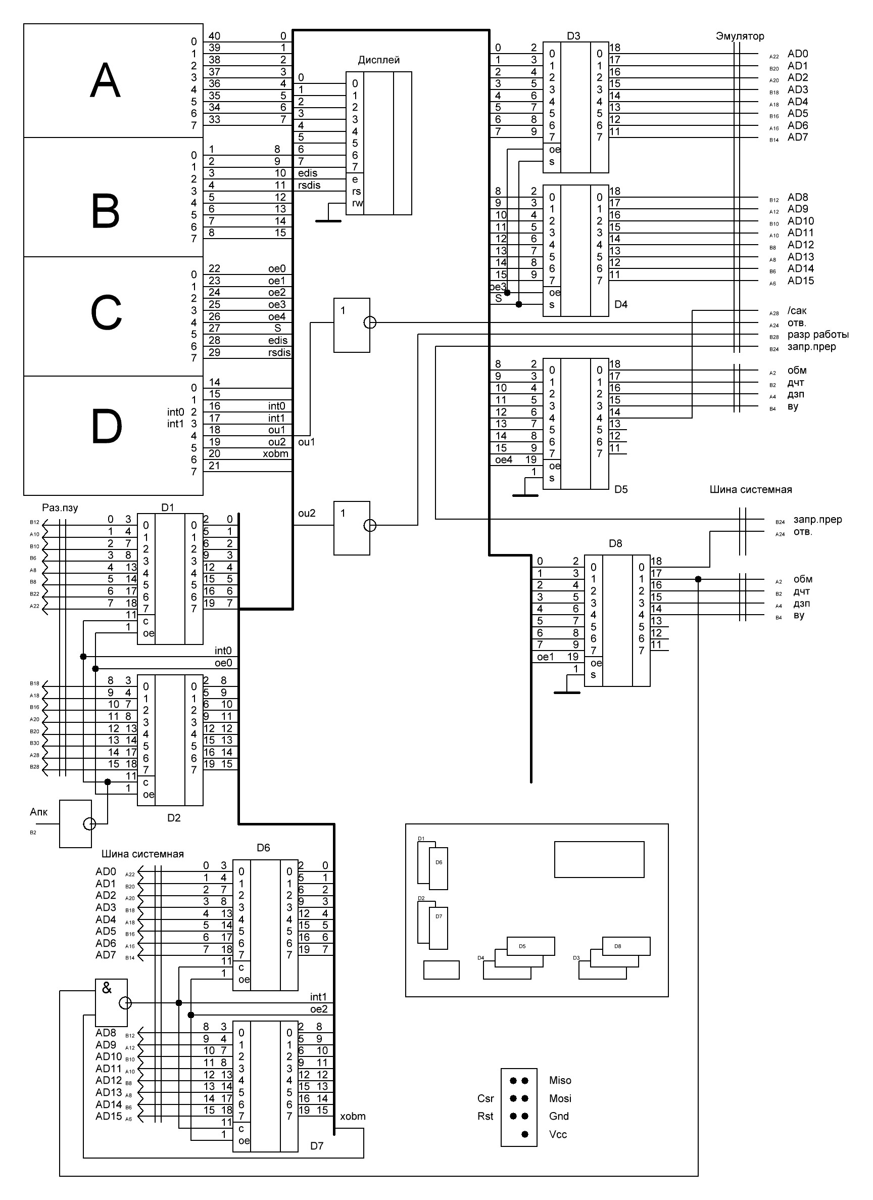 16 линий системной шины, сигналы ОБМ,ВУ,ДЧТ,ДЗП,ЗАПР ПРЕР, АПК.