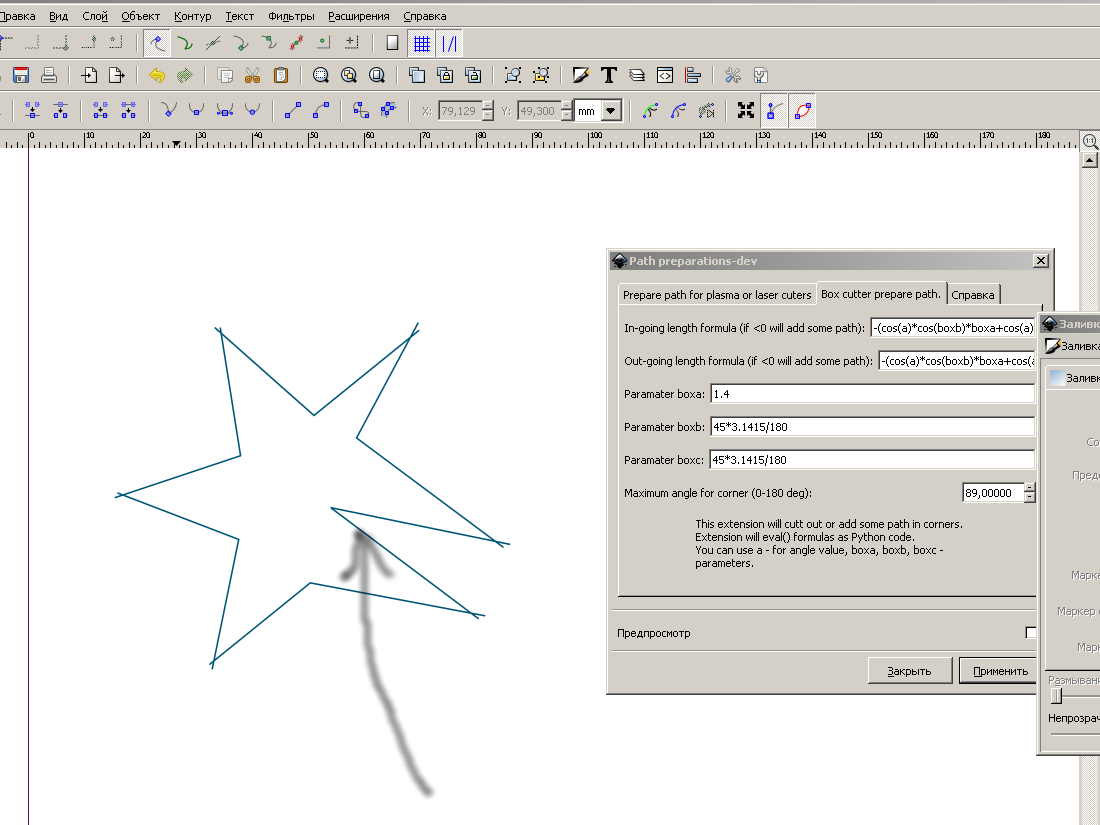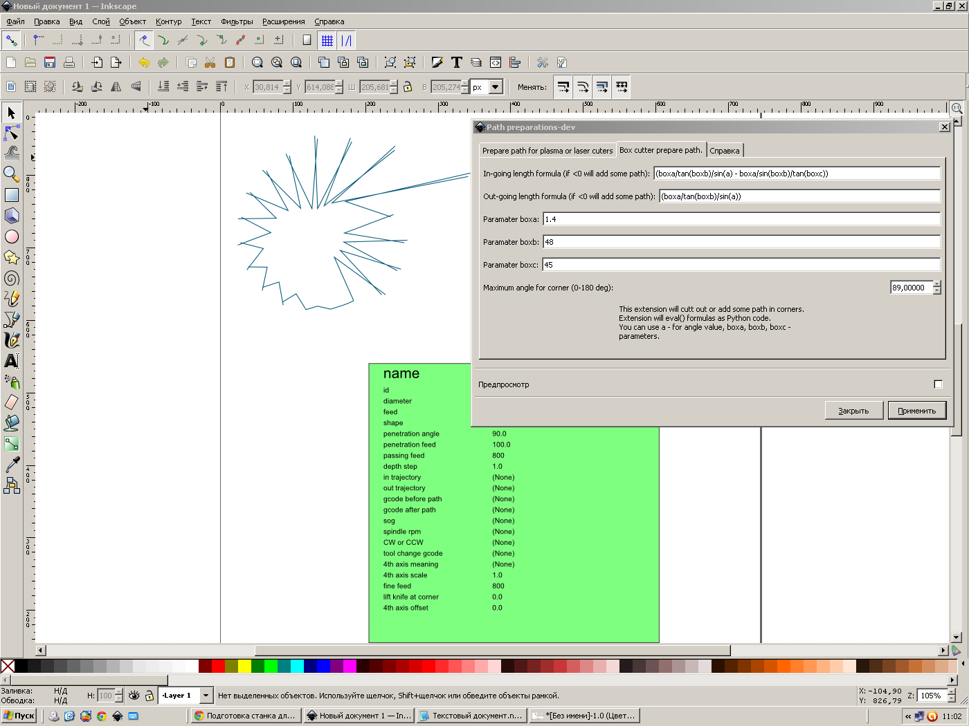 Выбери инструмент tangent knife в tools library, и лучше всего сделай шаблон - Сохраняешь полностью настроенный svg в директорию templates (рядом с extensions) и потом Файл-Новый-и выбираешь свой шаблон.boxxx2006 писал(а):вылетала зеленая таблица с моими параметрами для ножа?