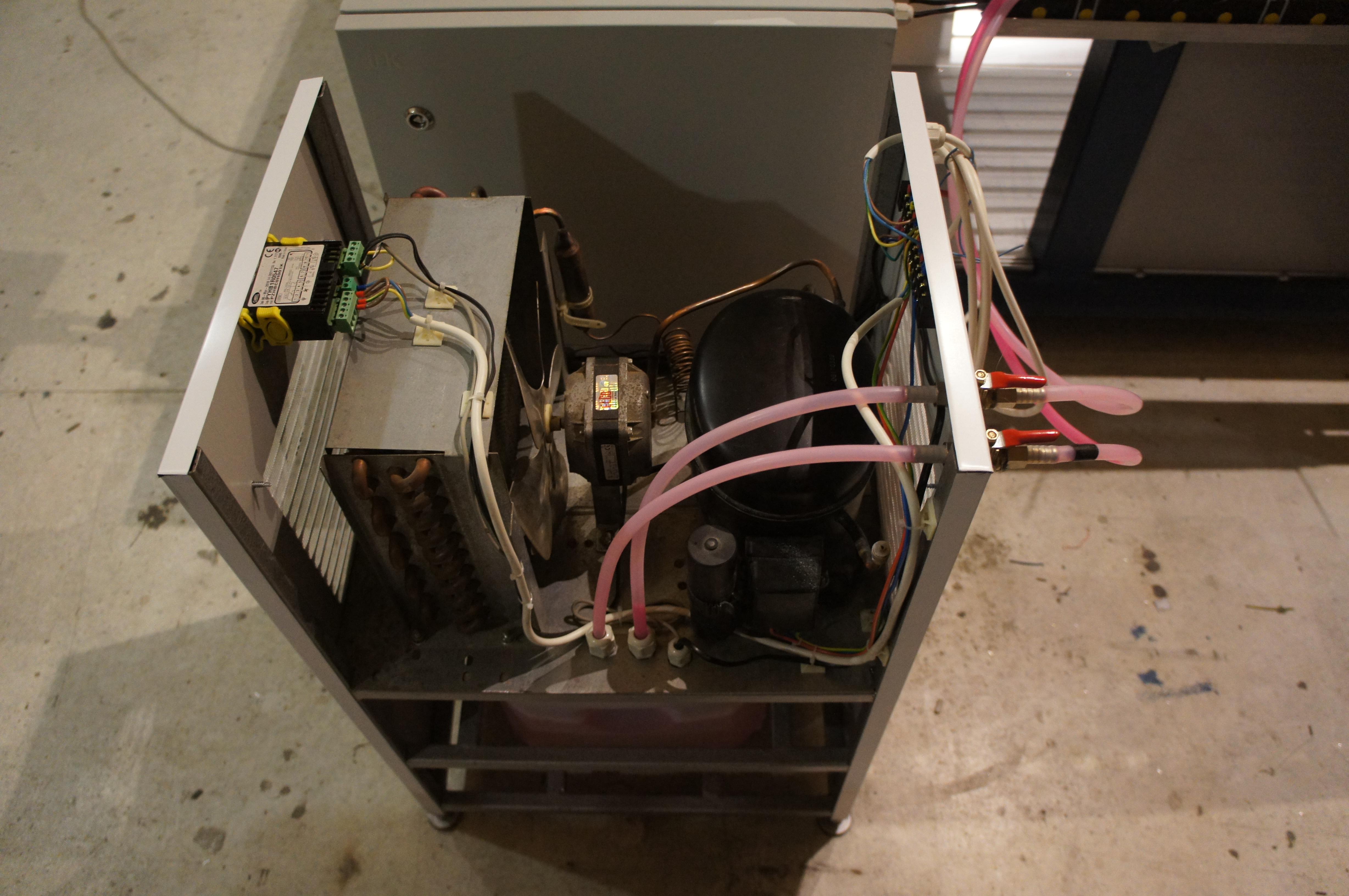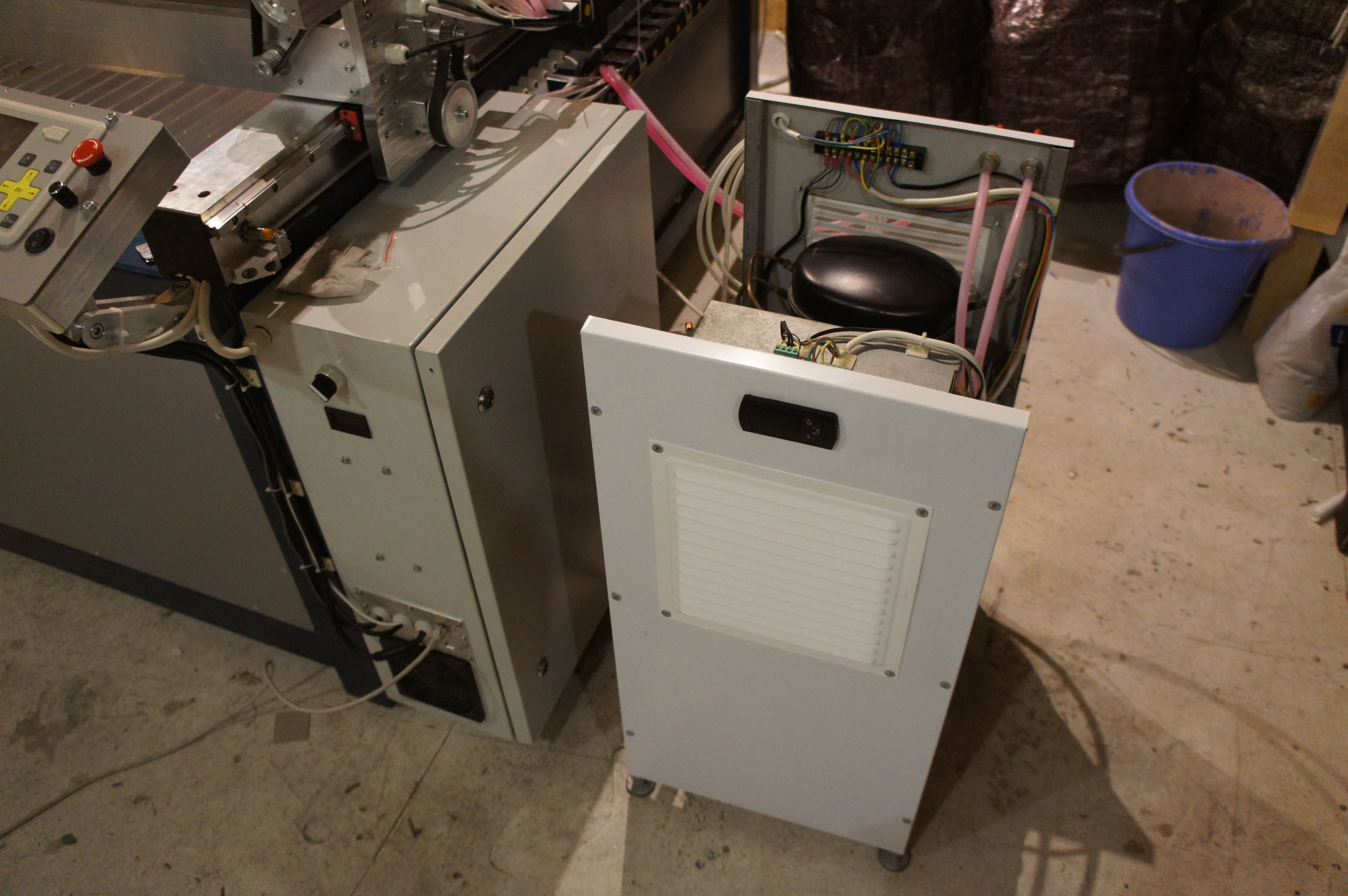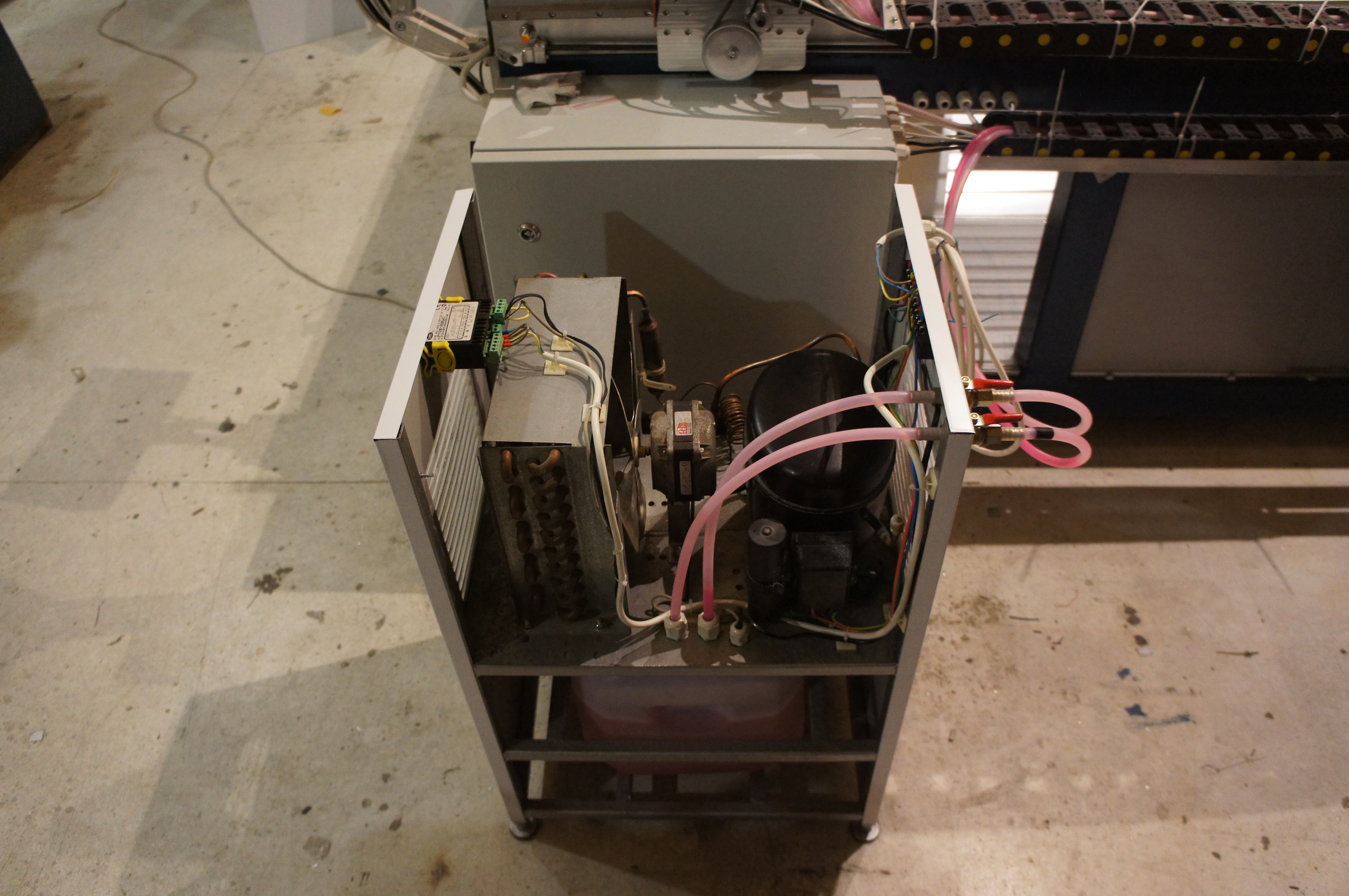 Сегодня поставил кожухи на портал и чиллер, починил датчик потока. Починил - громко сказано, просто прилепил на магнитик, который был в нем изначально, маленький неодимовый в виду лепешки Ф5 мм и толщиной 1 мм - и все заработало. Провел финальную юстировку зеркал, из-за винта на портале есть расхождение на третьем зеркале где-то 3 мм между точками попаданий на противоположных концах портала.
