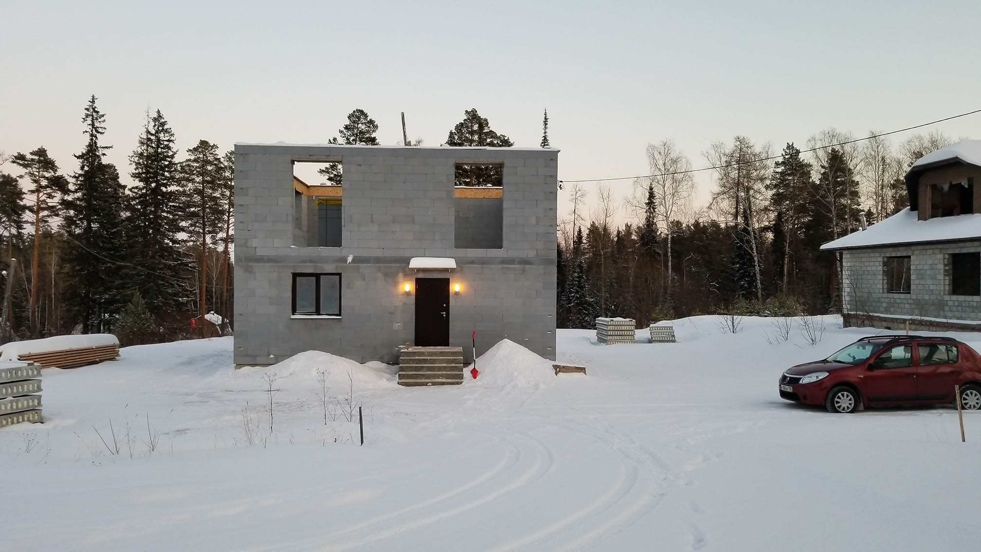 "Крыша" из плит позволила закрыться от снега и уложить утеплитель на перекрытие между этажами. Окна заколотил остатками опалубки. Очередная победа — первый этаж стал теплым!