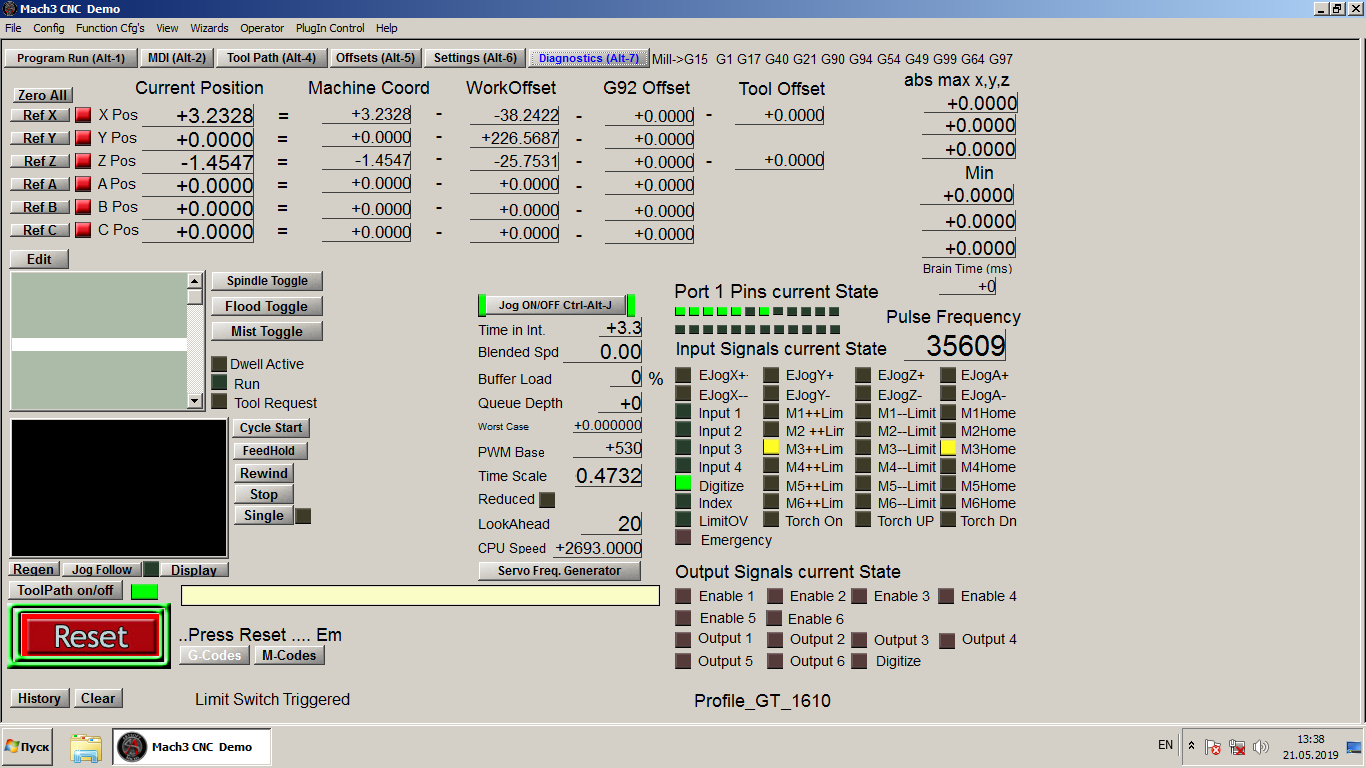 Еще проблема вылезла. Где и что я поменял - не могу понять. Сейчас шпиндель при уменьшении оборотов программно, наоборот их увеличивает. И появилась непонятная ситуация: шпиндель я могу запустить только после выхода в нули; потом, повторно, шпиндель не запускается и вылазит сообщение, что активен лимитный триггер, но в диагностике ничего не активно. Да и при чем тут шпиндель и триггер?! При попытке запустить шпиндель делает 1/6 часть оборота, а потом уже сообщение выскакивает.