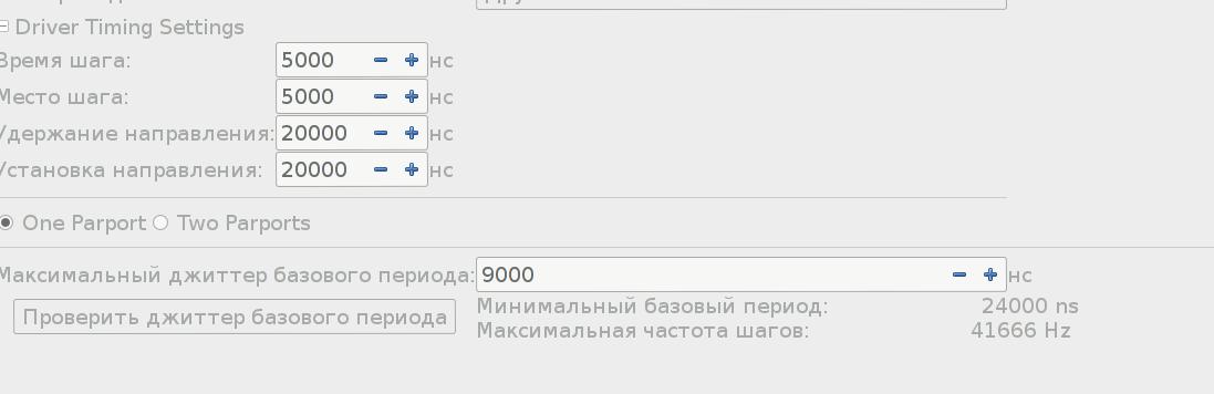 Для драйверов ШД, в linuxcnc рекомендуют тайминги драйвера умножать на 2.. для надежности.. Время шага и место шага я всегда ставил 10000. Сейчас по моему тоже так стоит.. Как будет возможность заглянуть в берлогу - гляну.. сейчас не до станков.. Лето.. дети приехали из ВУЗов... забросил все свои "хобби"ты.. и электронику и металло-железку..