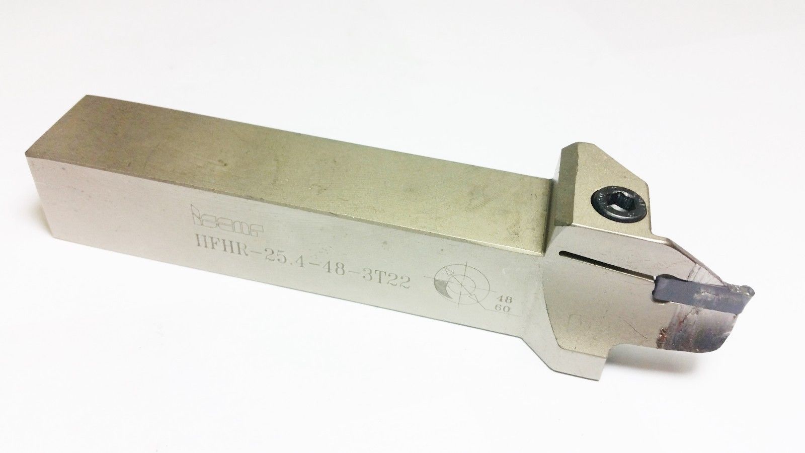 Пробовал брать подобный ровный отрезной резец с винтиком и им проточить в торце канавку. Пластинку вытаскивал из резца на 7мм и с небольшой подачей врезался. Примерно 3-4мм заглубиться и начинает снизу пластинка тереться об канавку.