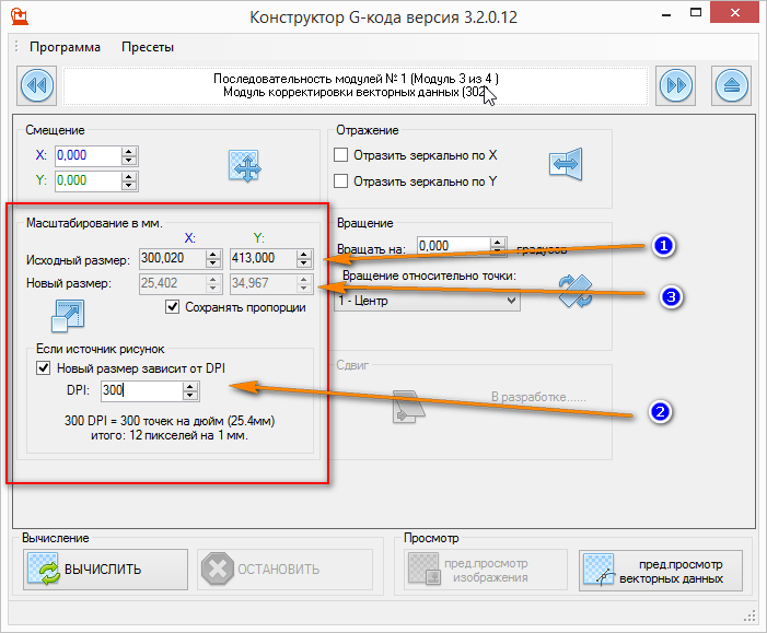 Имея исходное изображение размером 300х412 пикселей (пункт №1), мы указываем что данное изображение сохранялось с применением DPI равное 300, что означает 12 пикселей на 1 мм. (пункт №2),