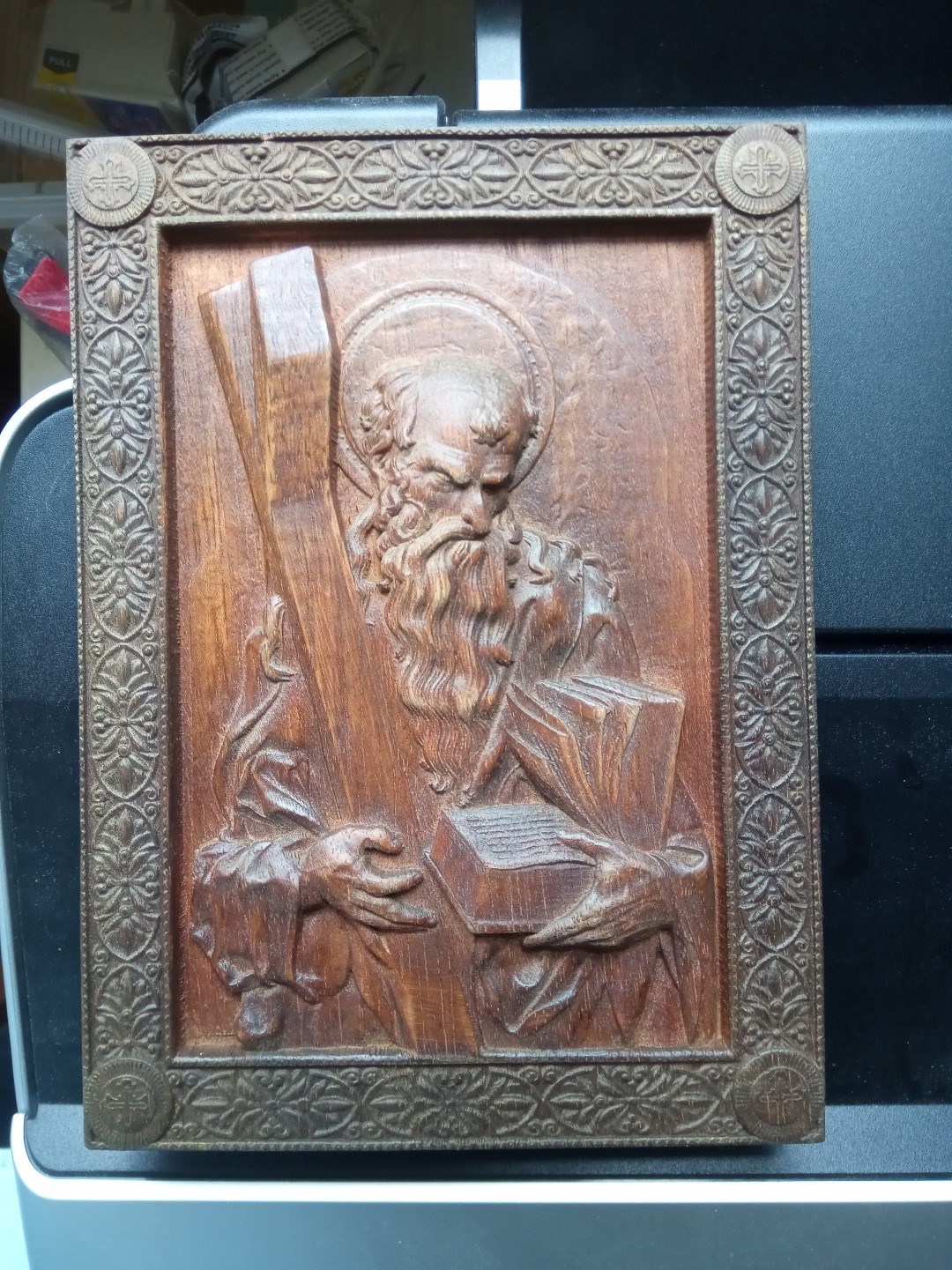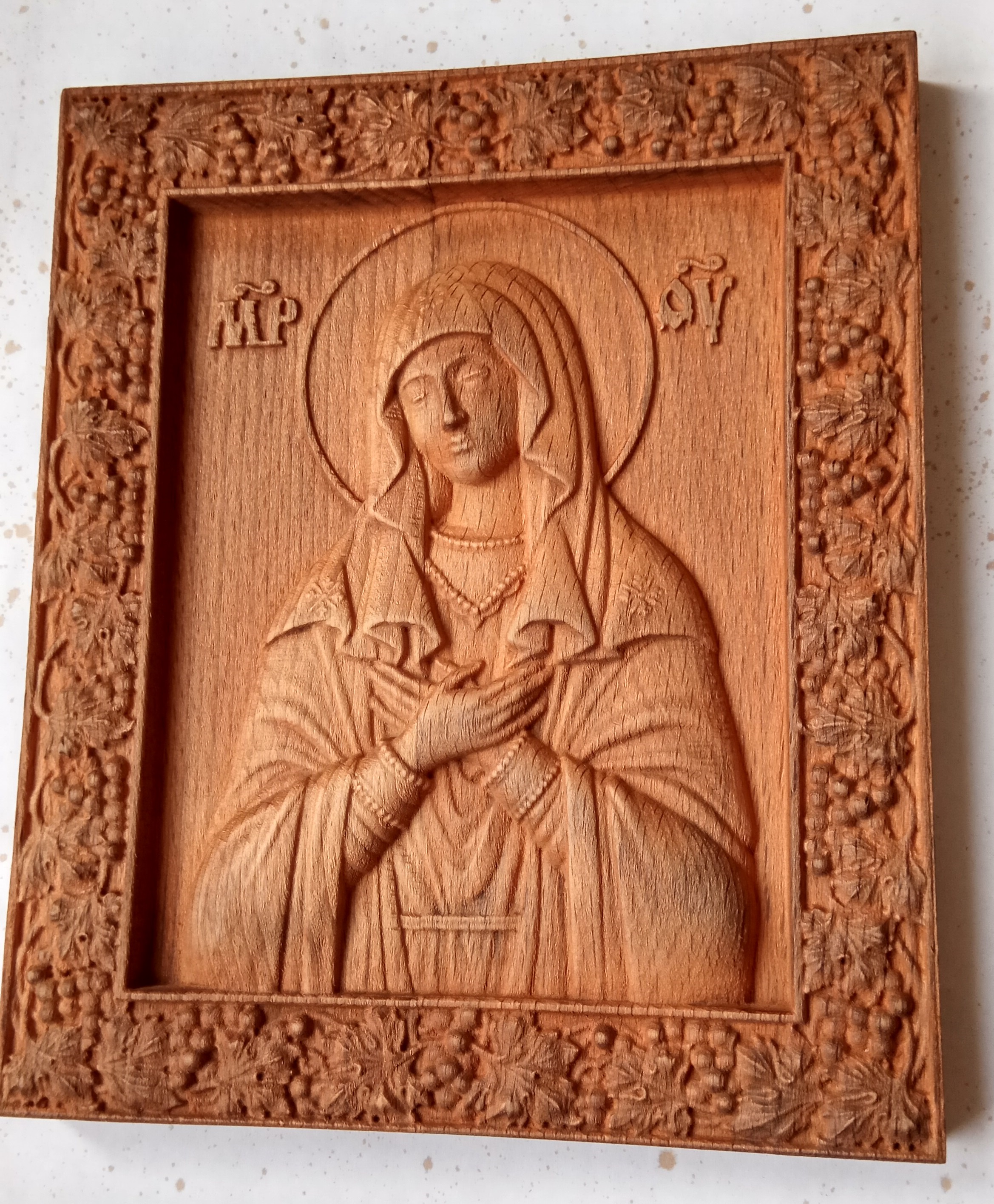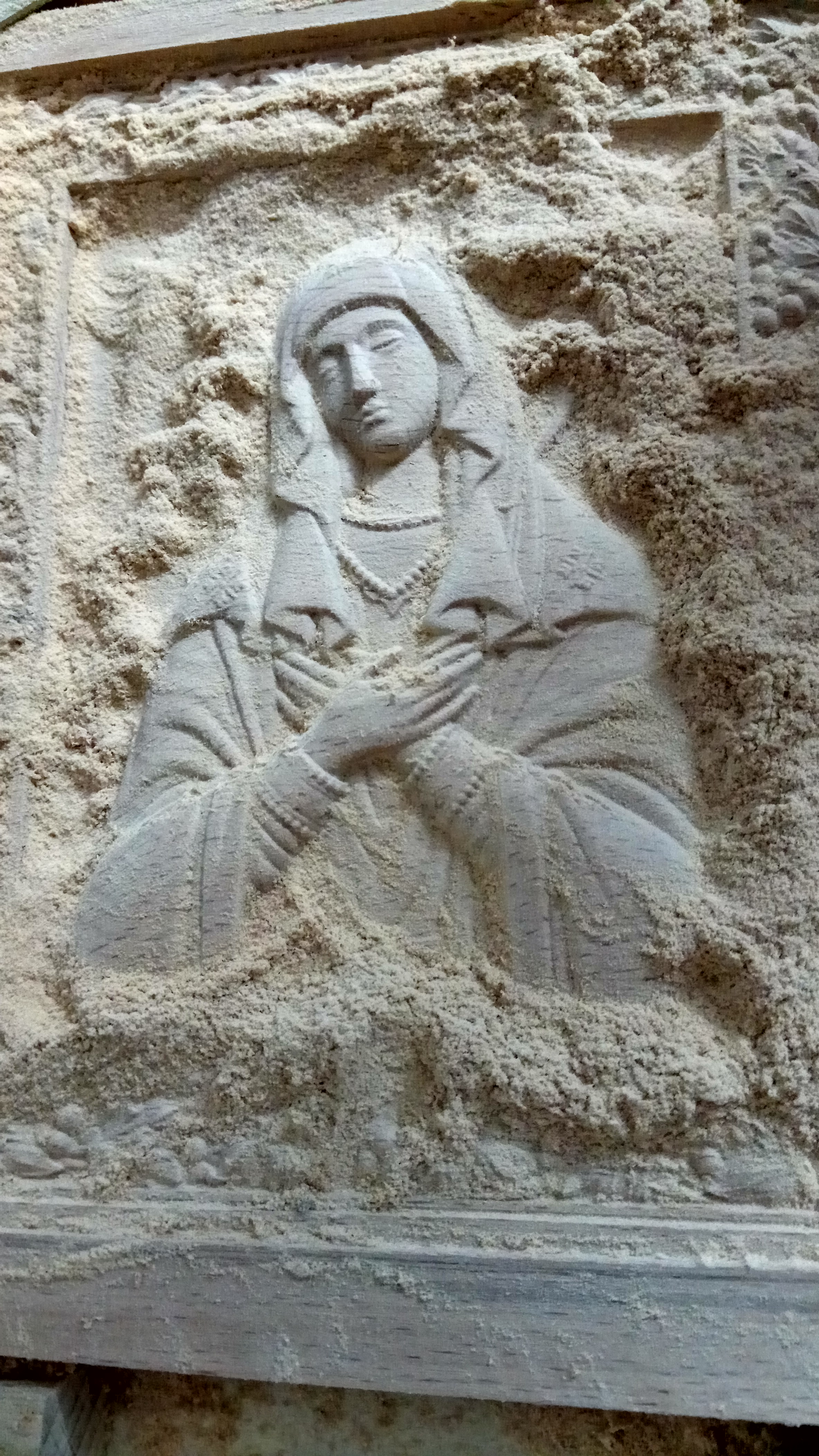 Итог: При движении по X произошел сбой не знаю чего. Можете наблюдать в правом нижнем углу иконы. От этого схватил много геморроя, т.к. уже была черновая обработка с припуском 1мм. Все равно пришлось подрабатывать наждачной бумагой в районе рук и головы образа.