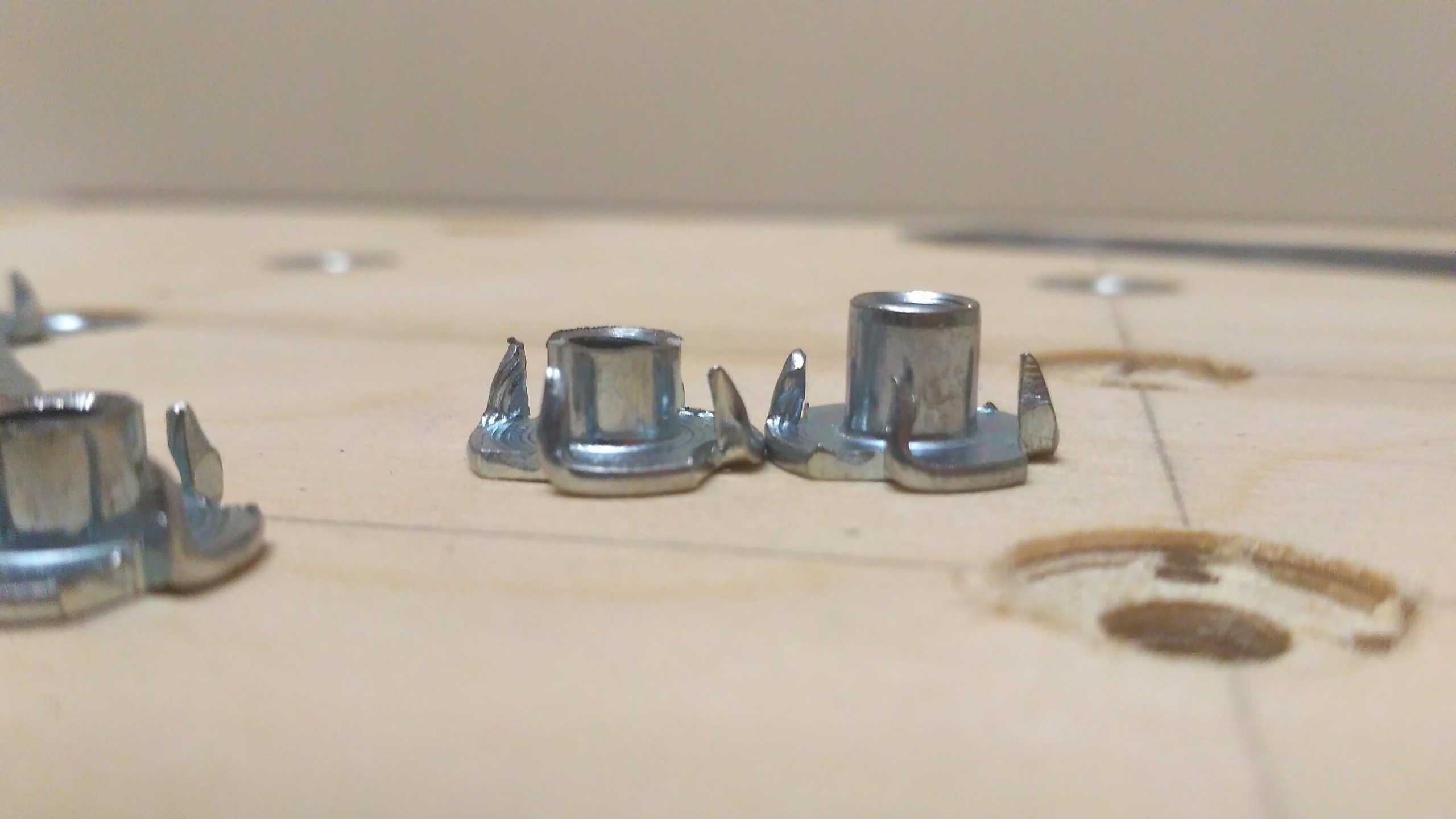 Жертвенный стол решил делать размерами 350 мм на 270 мм. Фанеру взял 10 мм шлифованную в мерлене, небольшой лист по 240 рублей. Для крепления заготовок решено было использовать мебельные забивные гайки 5 мм (их потребовалось 30 штук).
