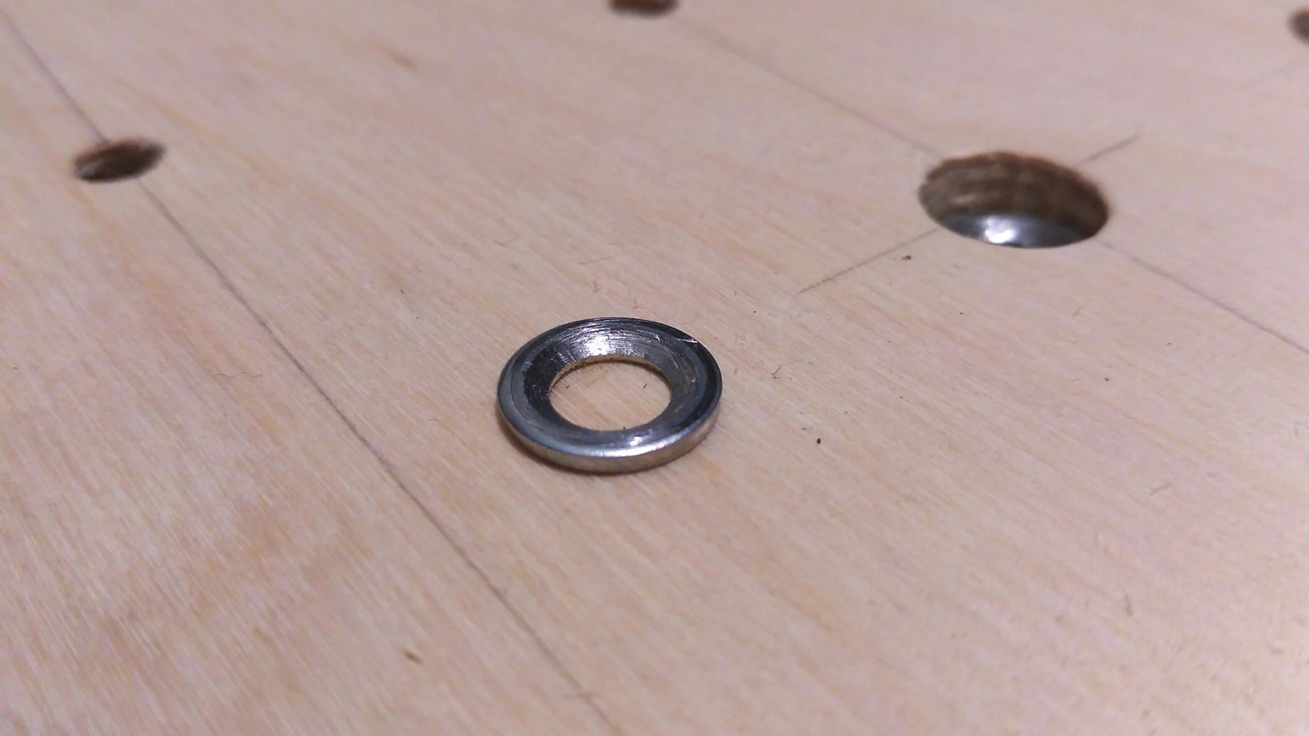 Образно накидал в кореле размеры и расположение креплений для жертвенного стола к станку (зелёным) и для забивных гаек (синим). Расчертил размеры и расположение отверстий, вырезал фанеру, на станке же отфрезеровал нужные отверстия для забивных гаек. В итоге вышло такое: Центральные 12 гаек сточил по высоте, чтобы сильнее углублялись в фанеру и в случае чего не задеть их фрезой. Для крепления к столу решил использовать следующую схему, в паз алюминиевого стола вставляется пластина (пластина для упора и чтобы не крутилась) с гайкой (гайкой вниз) и через фанеру в неё вкручиваются винты 5 мм с конусной шляпкой, вкручивал через шайбы (в шайбах предварительно высверлил конусы, чтобы сильнее утопить винты). Отверстия так же отфрезеровал на станке, оставив толщину фанеры 4,1 мм. Диаметр отверстий вышел 12,5 мм с заглубление 5,9 мм. Гайки решил припаять, заняло не так много времени. В итоге получилось как-то так: Крепежные прижимы заменю на прижимы из фанеры, т.к. прижимы из алюминия довольно скользкие и по дереву и по металлу.