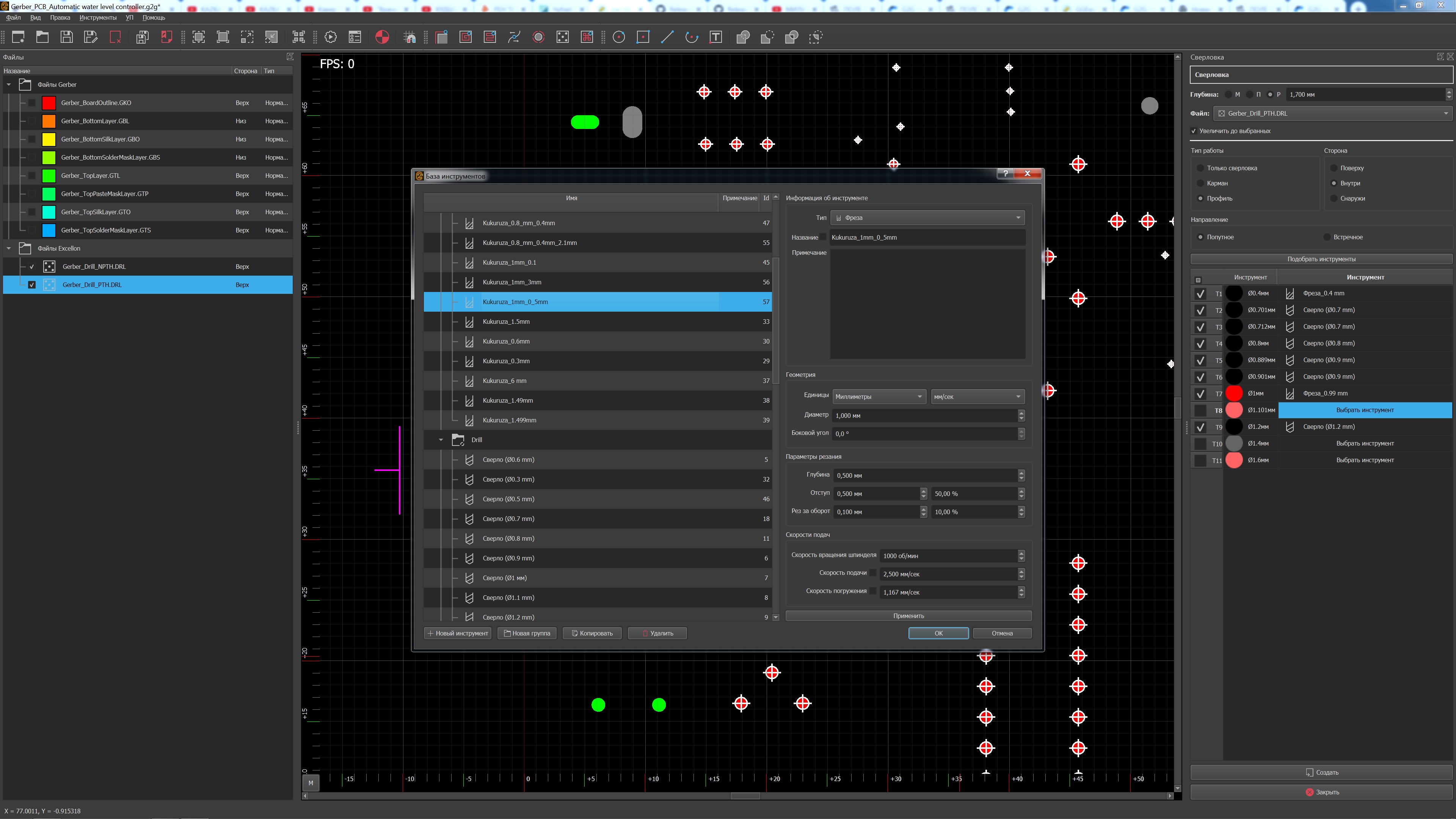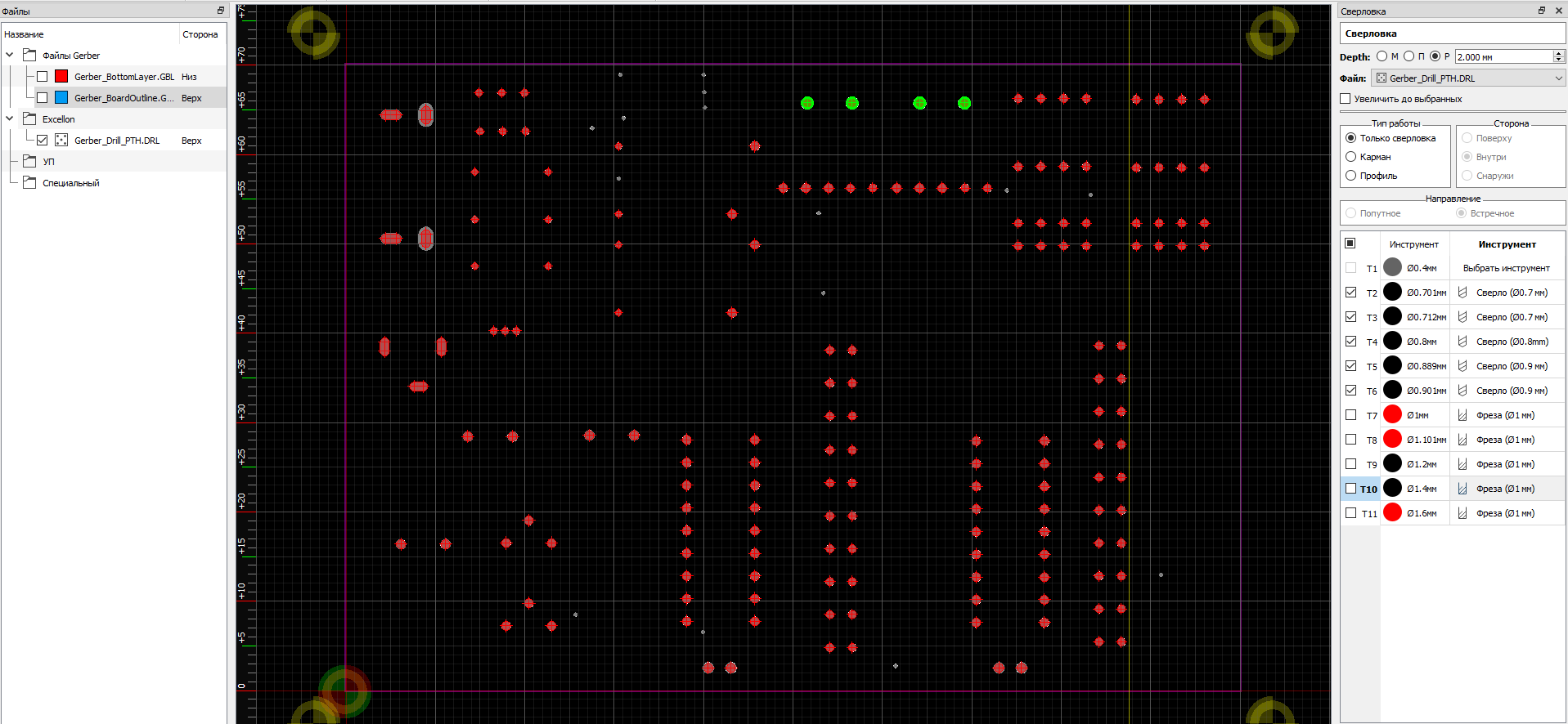 А вот здесь не дает выбрать сверло, так как прорезь и отверстия почему то отображаются под один инструмент. Должно или прорезь или отверстия. От себя добавлю. Перед тем, как создать гербер, продумываю будущие отверстия. Основные отверстия обычно сверлю 0.7мм, хватает за глаза. И в в проекте диаметры указываю 0.7мм. Если отверстия равны 1мм, то в проекте на этих отверстиях ставлю размер 1.1мм и это уже идет под фрезеровку. Ну и большие отверстия уже тоже идут под фрезеровку.