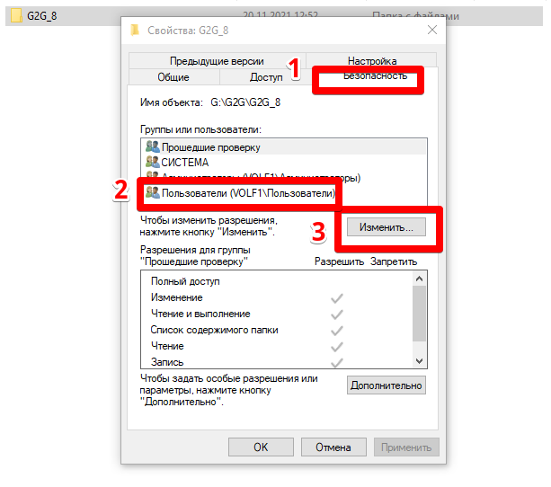 Выбрать вкладку "Безопасность" и нажать кнопку изменить.