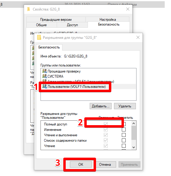 В появившемся диалоговом окне выбрать имя пользователя и установить галочку "Полный доступ". Затем нажать кнопки ОК, ОК. И у вас все работать будет отлично.