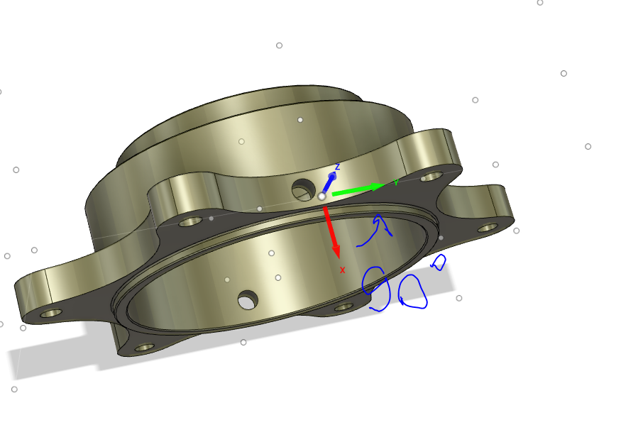 самое простое, если на модели нет прямых граней/плоскостей для определения направления осей, чтоб просто на них ткнуть - в дереве компонентов, над ними - папка ориджин. Включить их видимость, и там выбрать нужную плоскость, а флипами уже повернуть XY. Выбирать можно любую плоскость, не только перпендикулярную Z. То есть в твоем случае на плоскость фланца достаточно ткнуть.