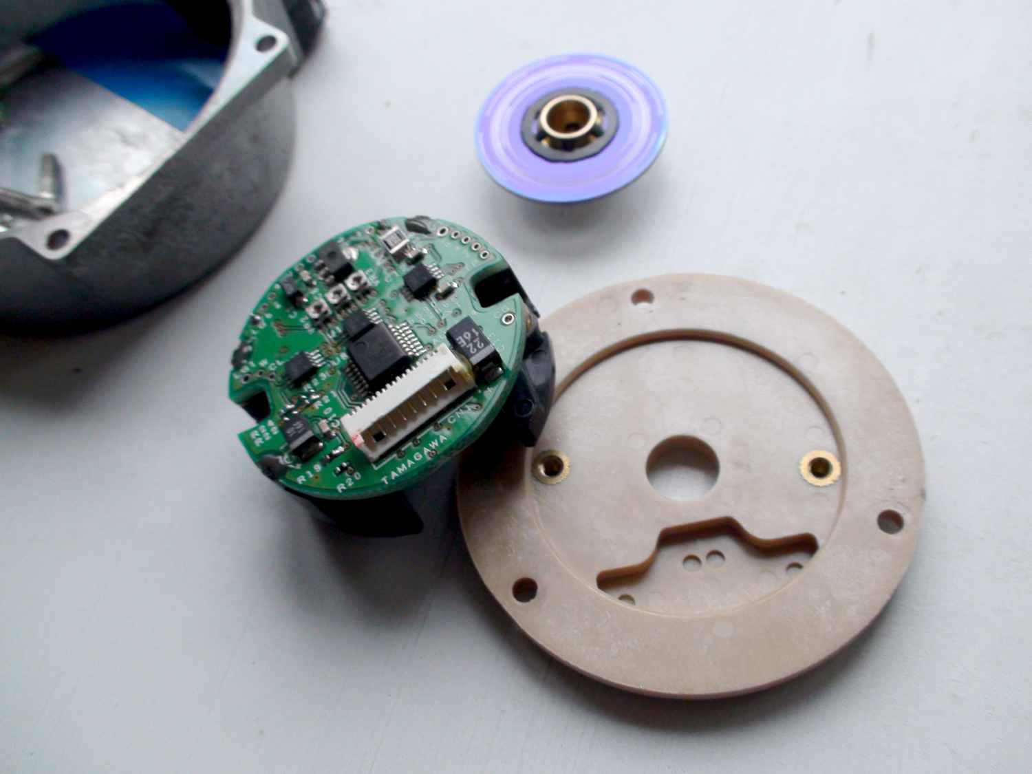 Решился распотрошить большой, но получилось как в анекдоте - "вскрытие показало, что пациент умер от вскрытия". Разобрал, все почистил, собрал назад, крутится от руки отлично, подключил, а энкодер мертвый. Вроде все старался аккуратно делать, плату руками за детальки не хватал, диск энкодерный тоже, держал за саму втулку, думал что может есть разница от диска до фотодиода, там можно на разном расстоянии закрепить, подвигал в несколько положений - безрезультатно. Энкодер там простой, на 2048 линий, думаю что если найти другой мотор и попробывать перекинуть, получится?