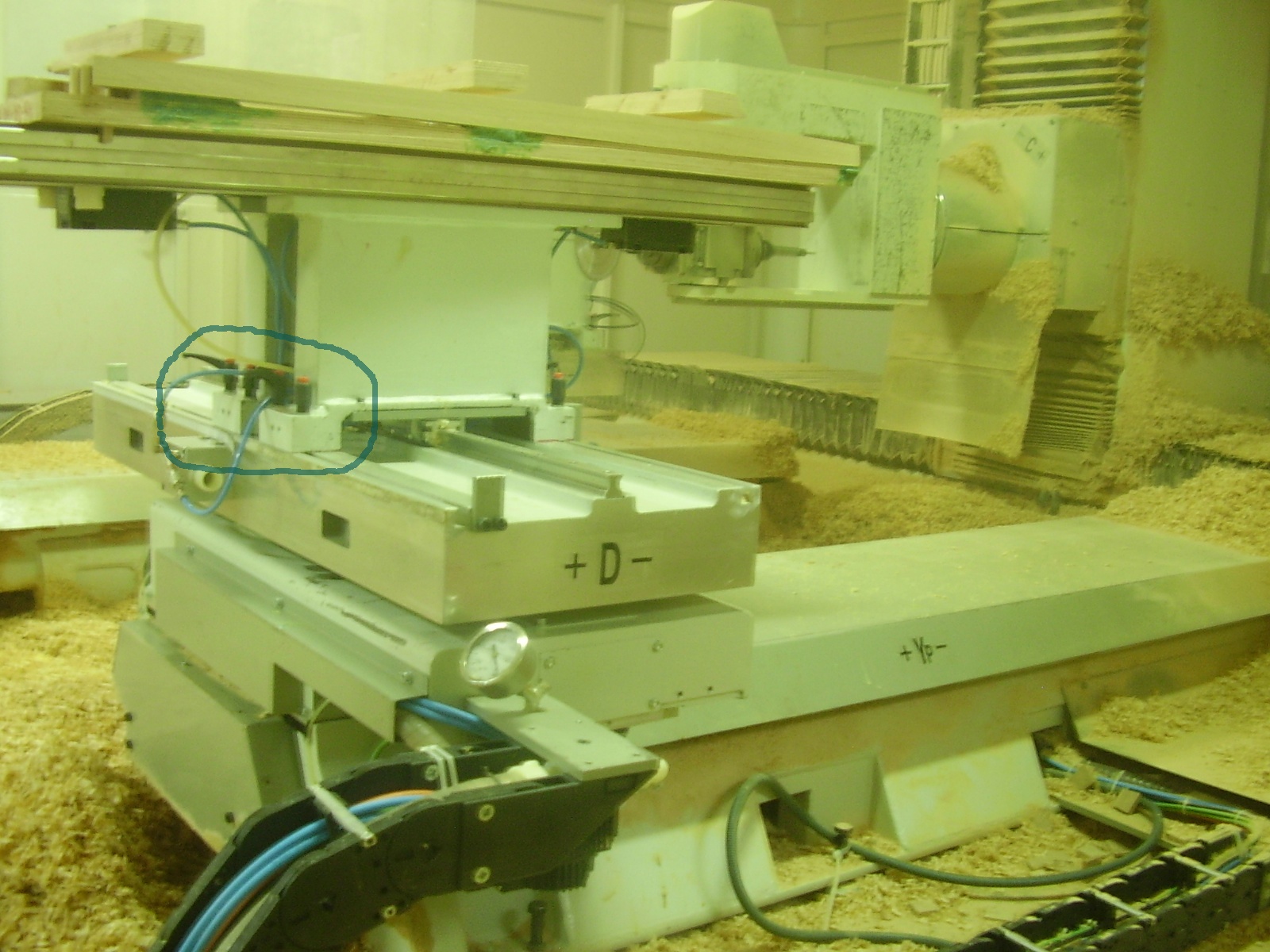 Б-рр,не знаю с чего начать,как говорил фишер,пока не потрогаешь сам не поймёш что к чему.на перреднем плане Y портал.на заднем икс+зэт.на Y располагается Д портал ,он оборачиваеся на 360 град.на нём 2 рельсы -это рабочий стол(видно одну правую).пневматика-да,правда,зажимы пневматические(у нас на фирме всё пневмо-дрели,молотки,шлифмашинки,шуруповёрты).энта штука требует 6 бар давления.(cnc).а есть в комплекте ваккумный компрессор 8.4 атмосфер.на ети 2 рельсы ставишь заготовку,её притягивает-не оторвёшь и в бой под фрезы.