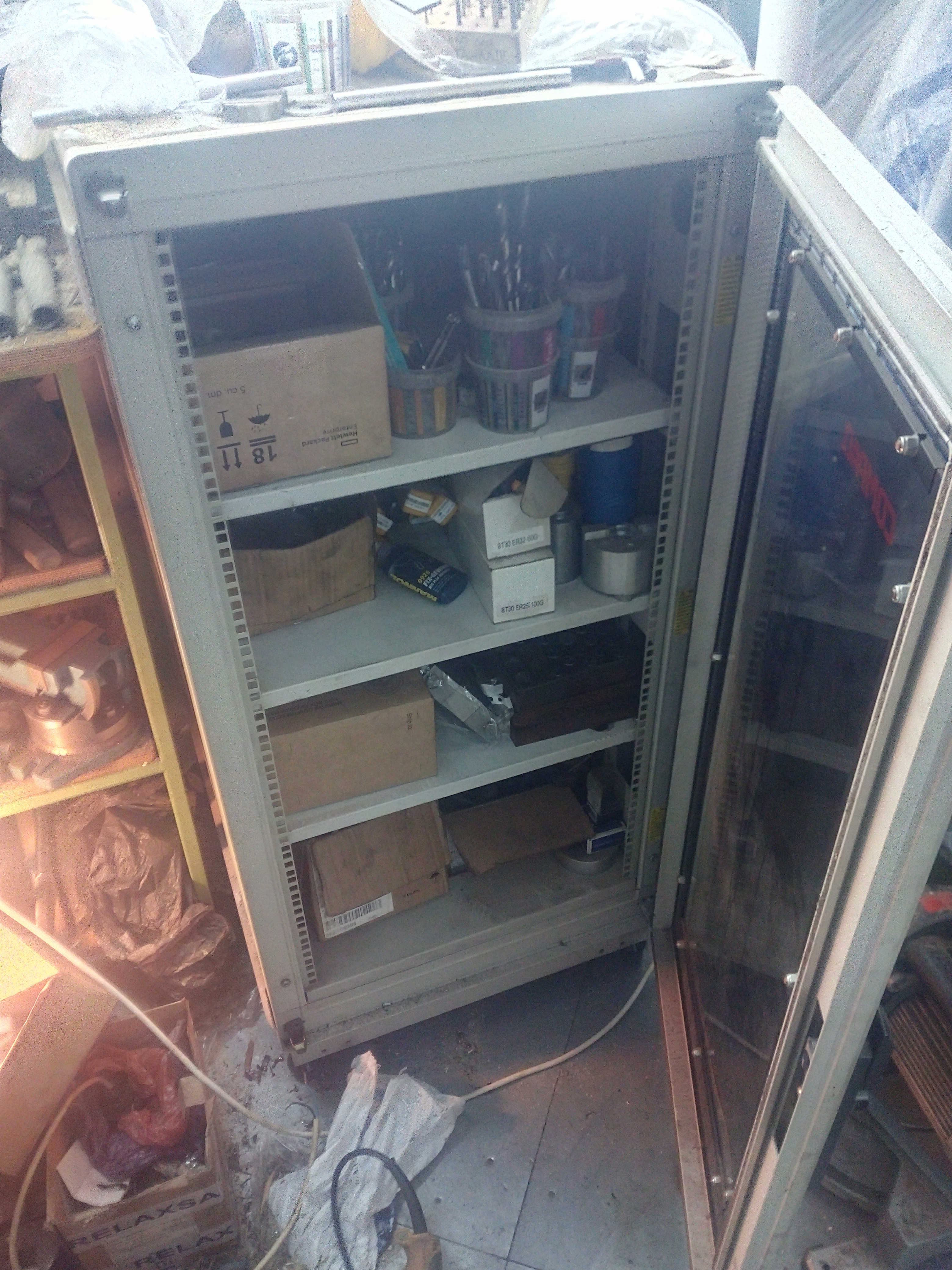 Очень удобен для хранения инструмента, но может быть использован и по прямому назначению. Передняя дверь с тонированной вставкой из поликарбоната, задняя металлическая перфорированная, обе закрываются на замок и на ключ (ключи утеряны). Внутри самодельные металлические полки.