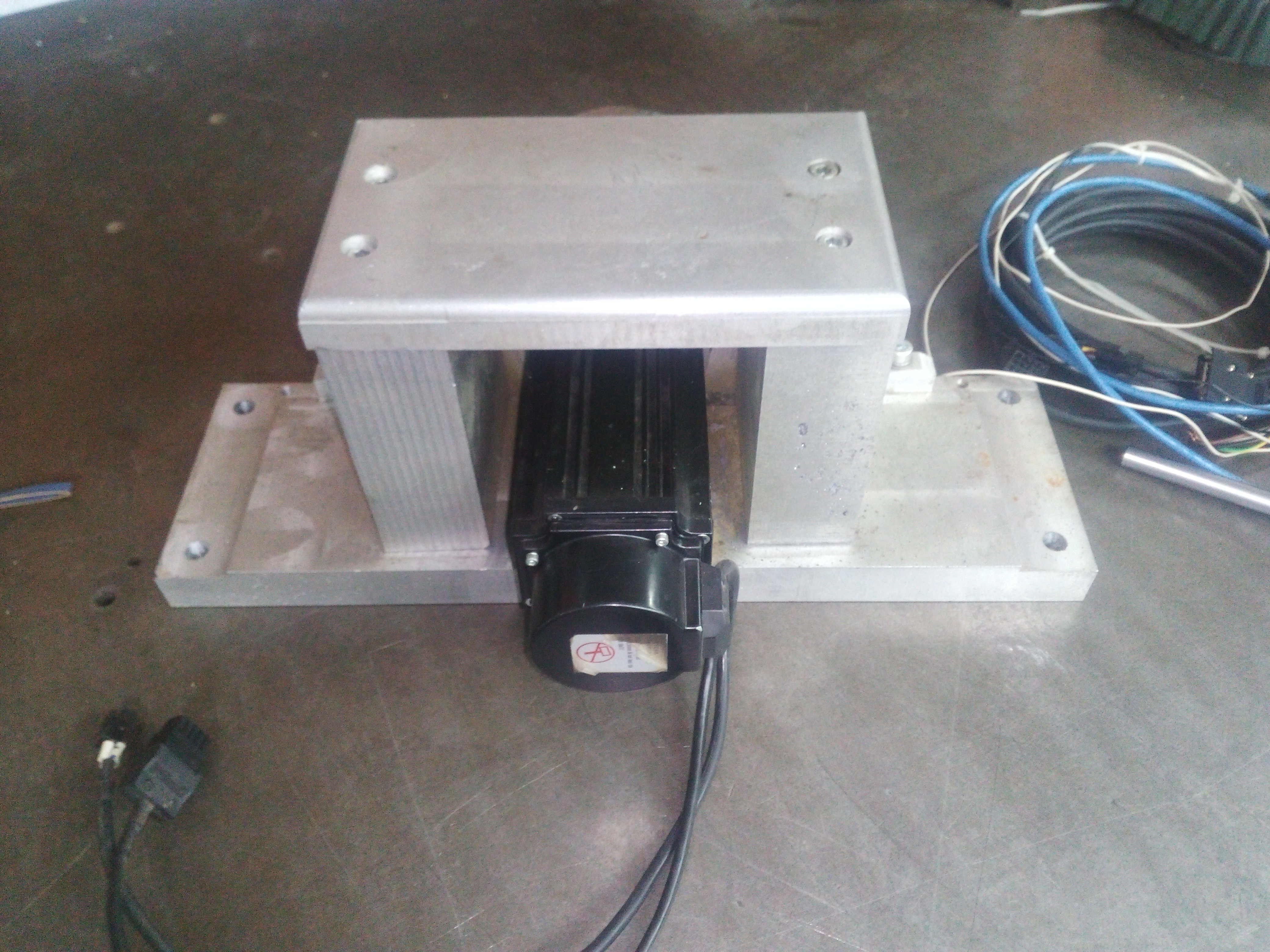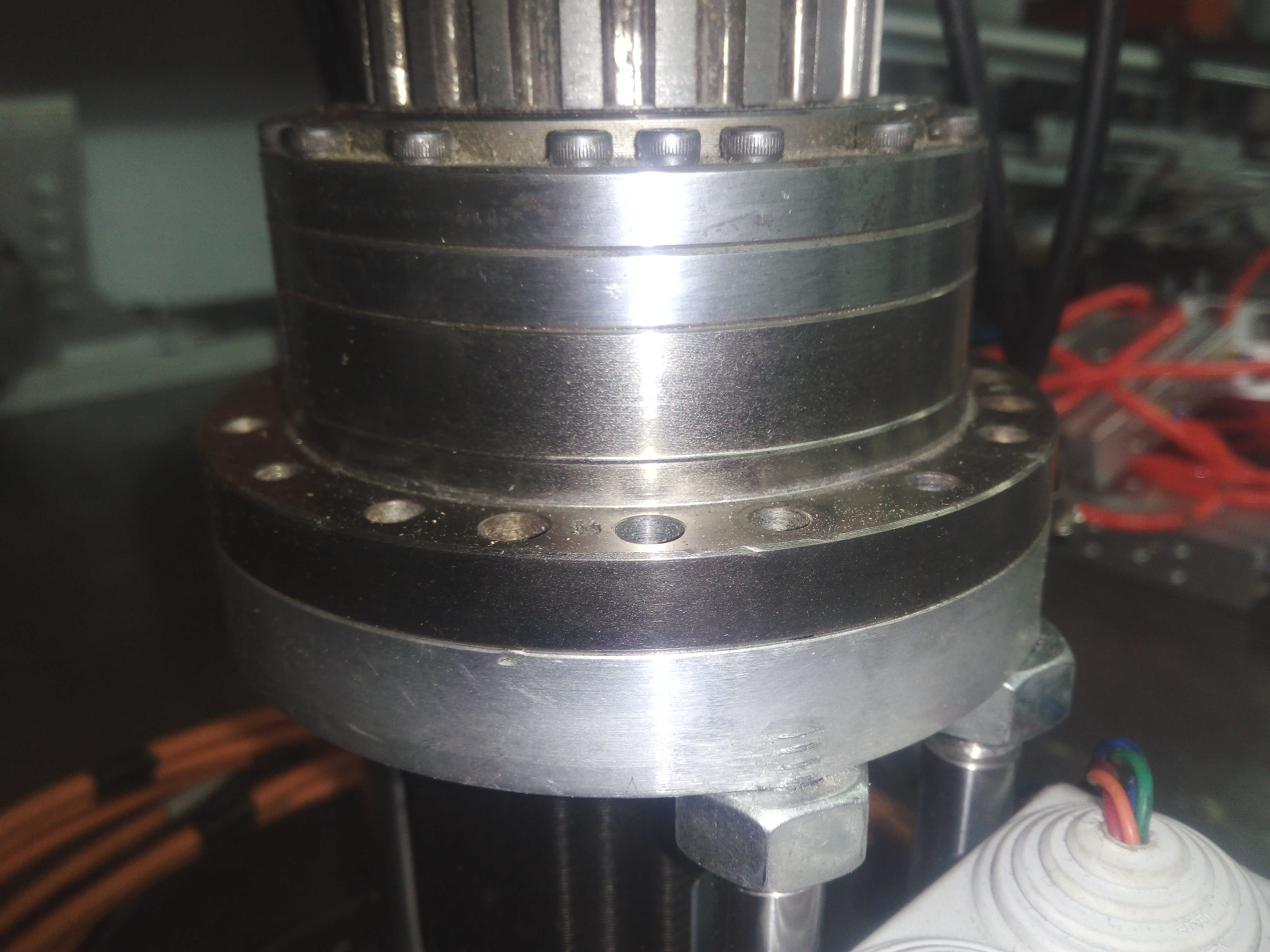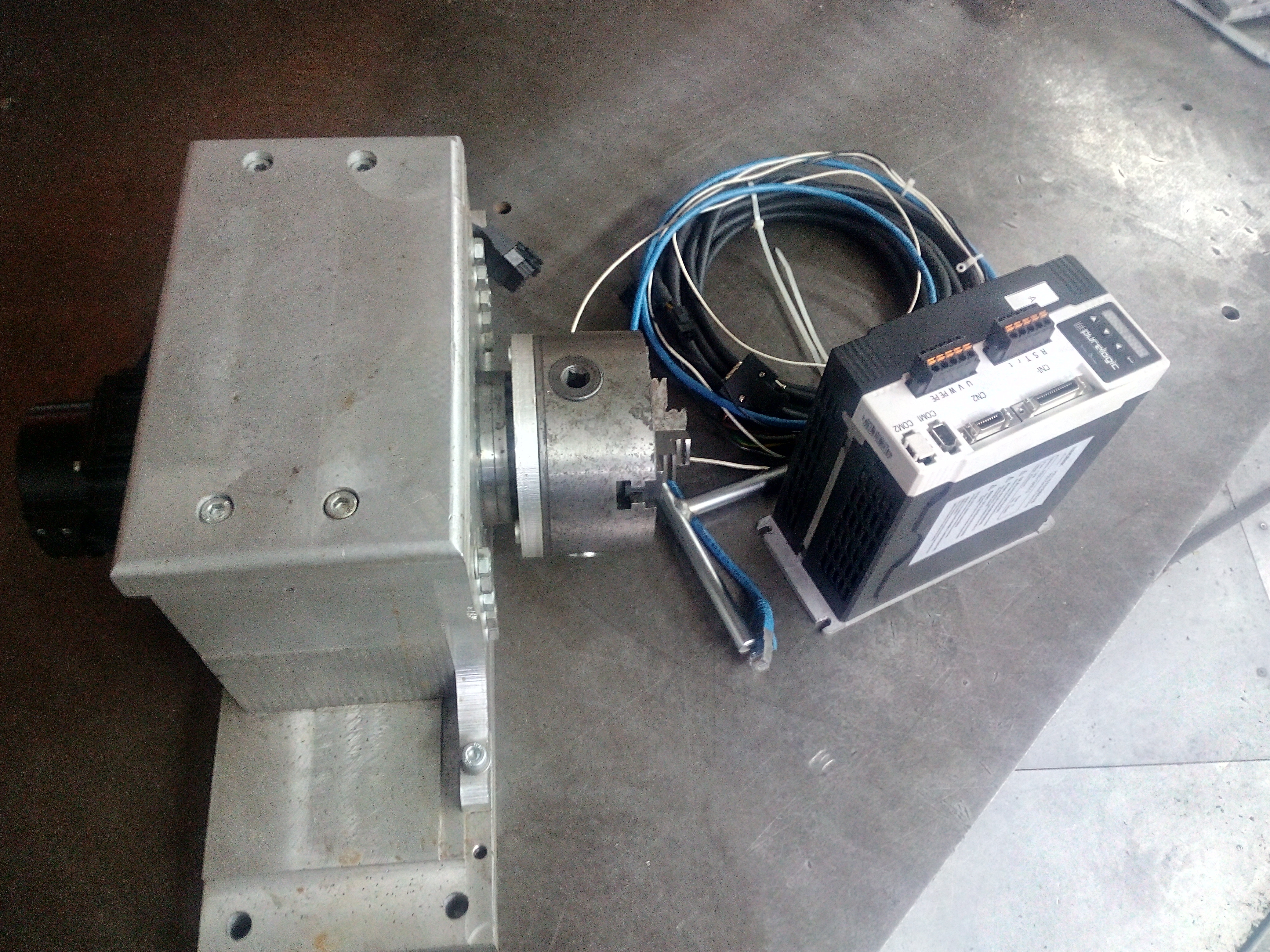 Корпус из толстых алюминиевых плит (16, 32, 55мм). Патрон токарный 125мм. Безлюфтовой волновой редуктор Harmonic Drive 25го габарита 1:50. Серводвигатель 90ST-M04025 - 1кВт, 2500 об/мин (макс 3000 об/мин.), 4 Нм. Сервоусилитель понимает степ/дир и аналог, провода 3м в комплекте.