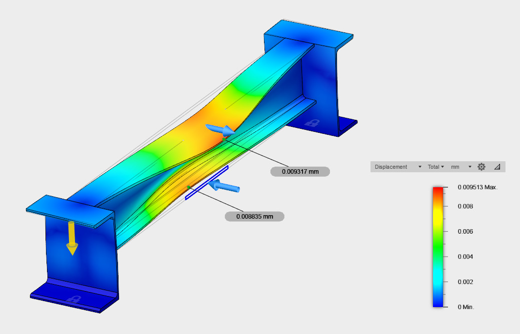 Ну тогда вопрос.. включаю в стресс тесте на прогиб гравитацию и прогиб уменьшается в сто раз, чой-то? На картинке ниже каждая синяя стрела - это сила в ~50 кгс (500 N). Желтая стрела - гравитация.